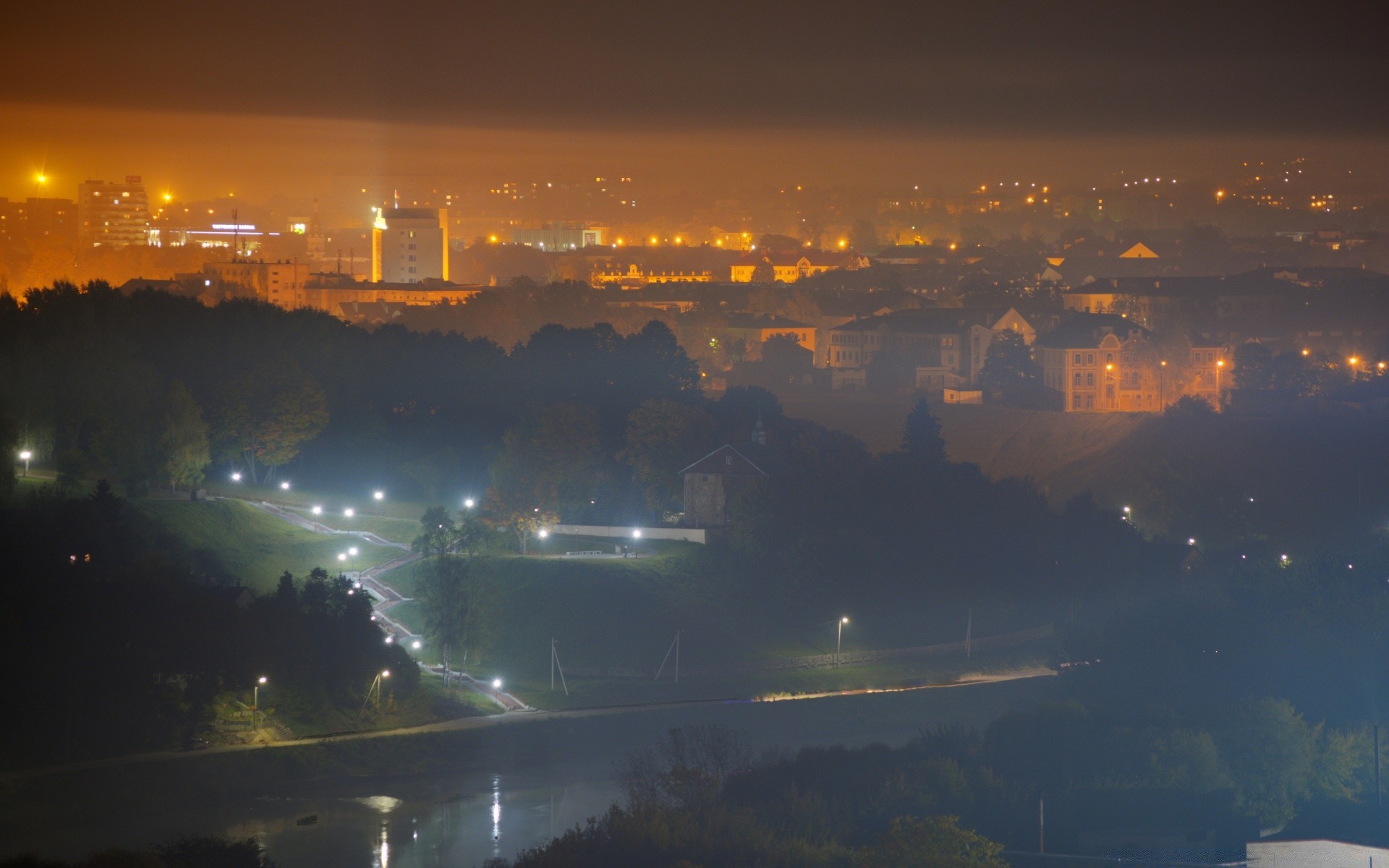 A night city surrounded by fog