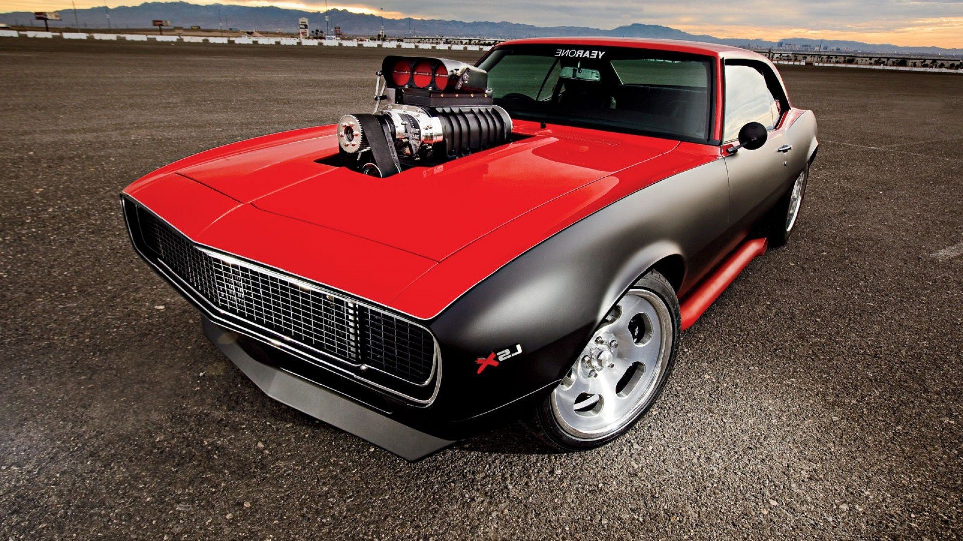 Red sports car on a prairie background