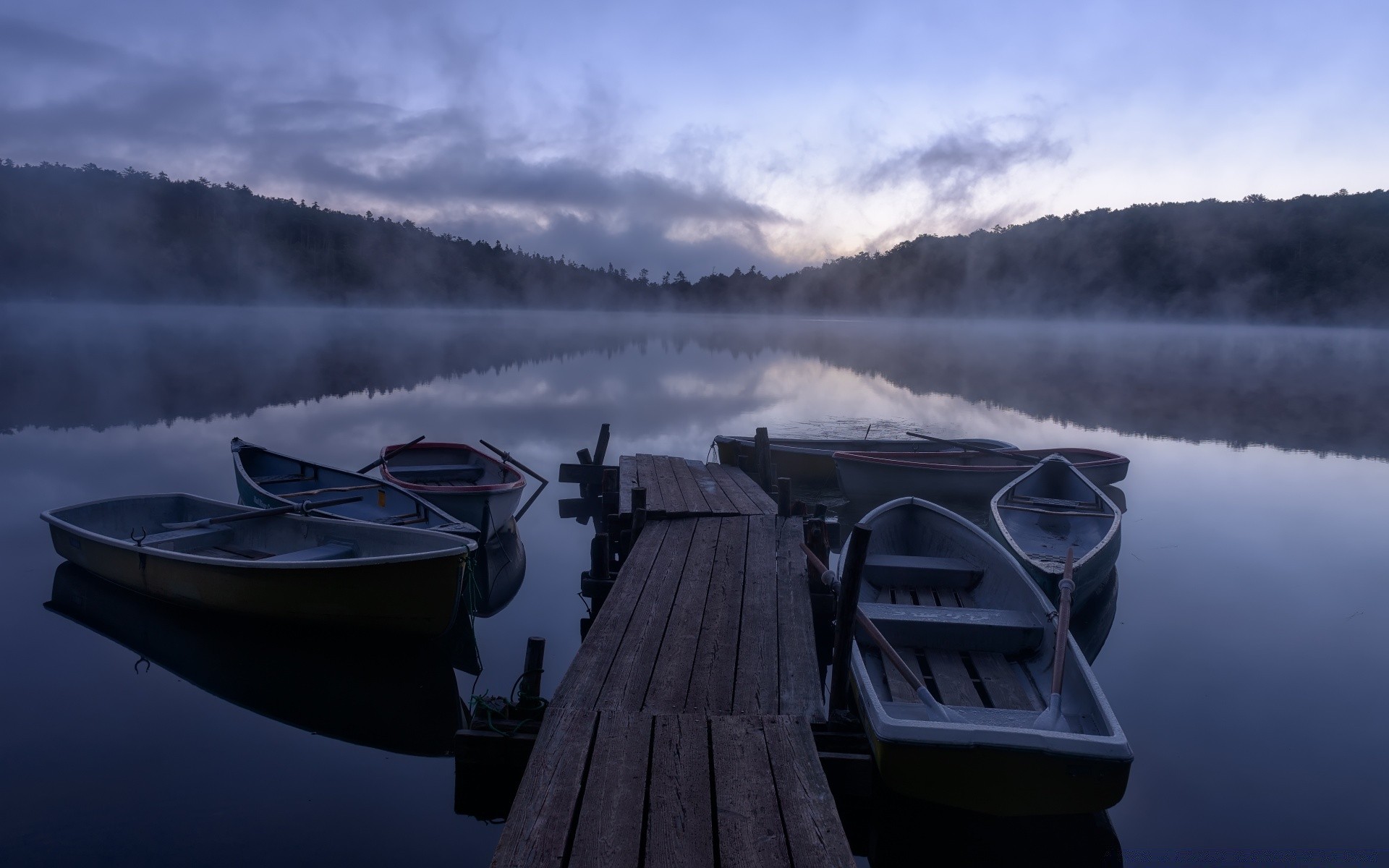 Wooden boats in the semi-darkness on the water