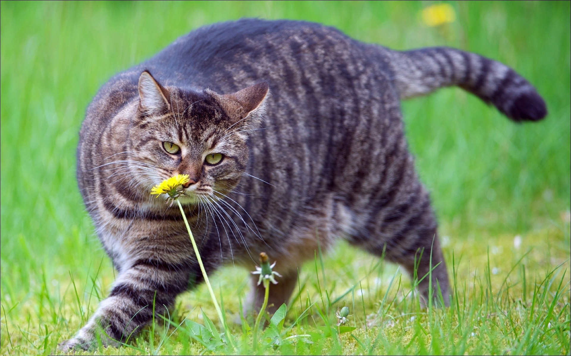 Striped cat sniffs dandelions in a clearing