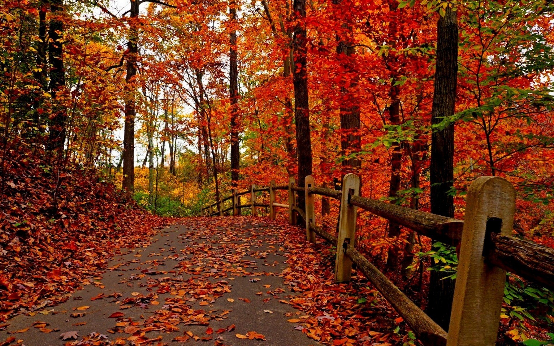 A road with a fence in the autumn red-yellow forest