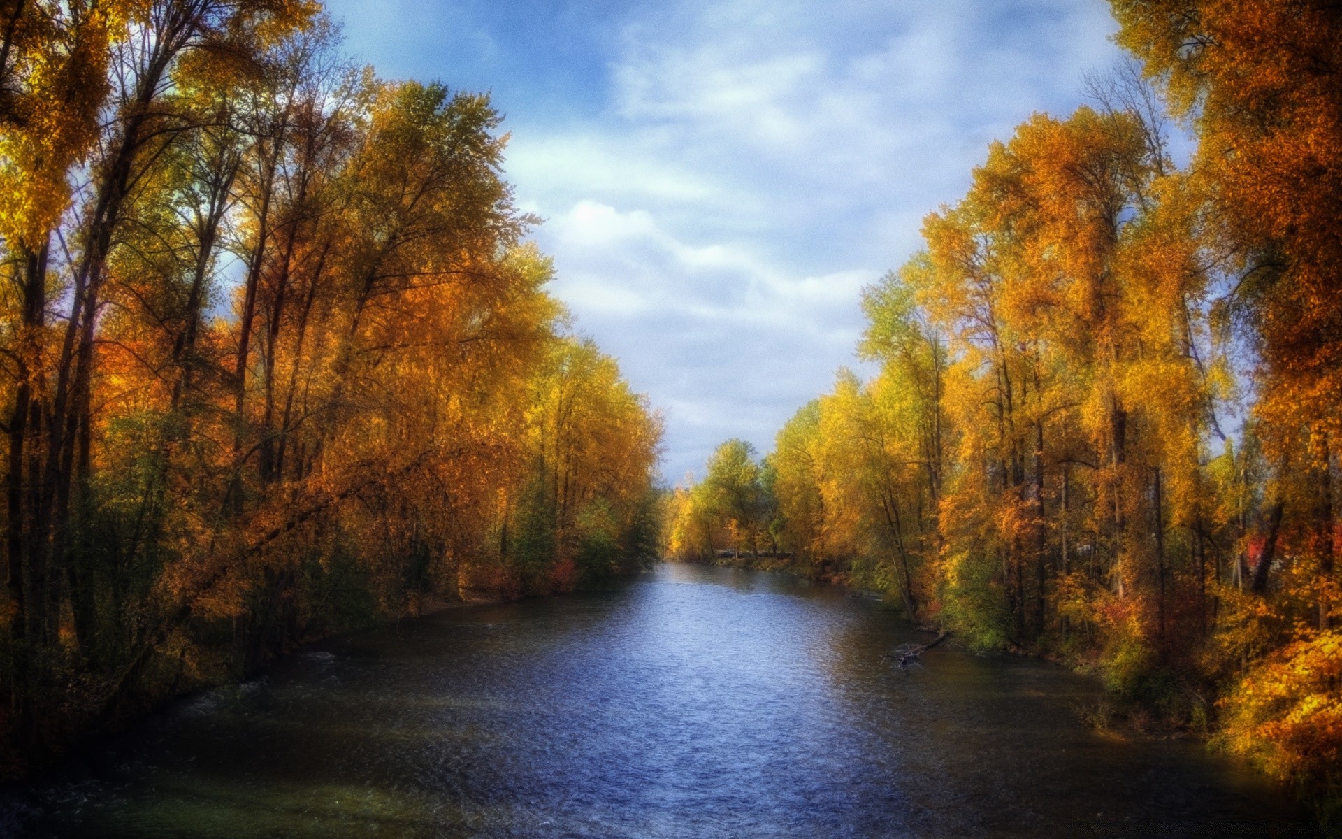 A mirror-clear reflection of the autumn forest in the river with light ripplesA mirror-clear reflection of the autumn forest in the river with light ripples
