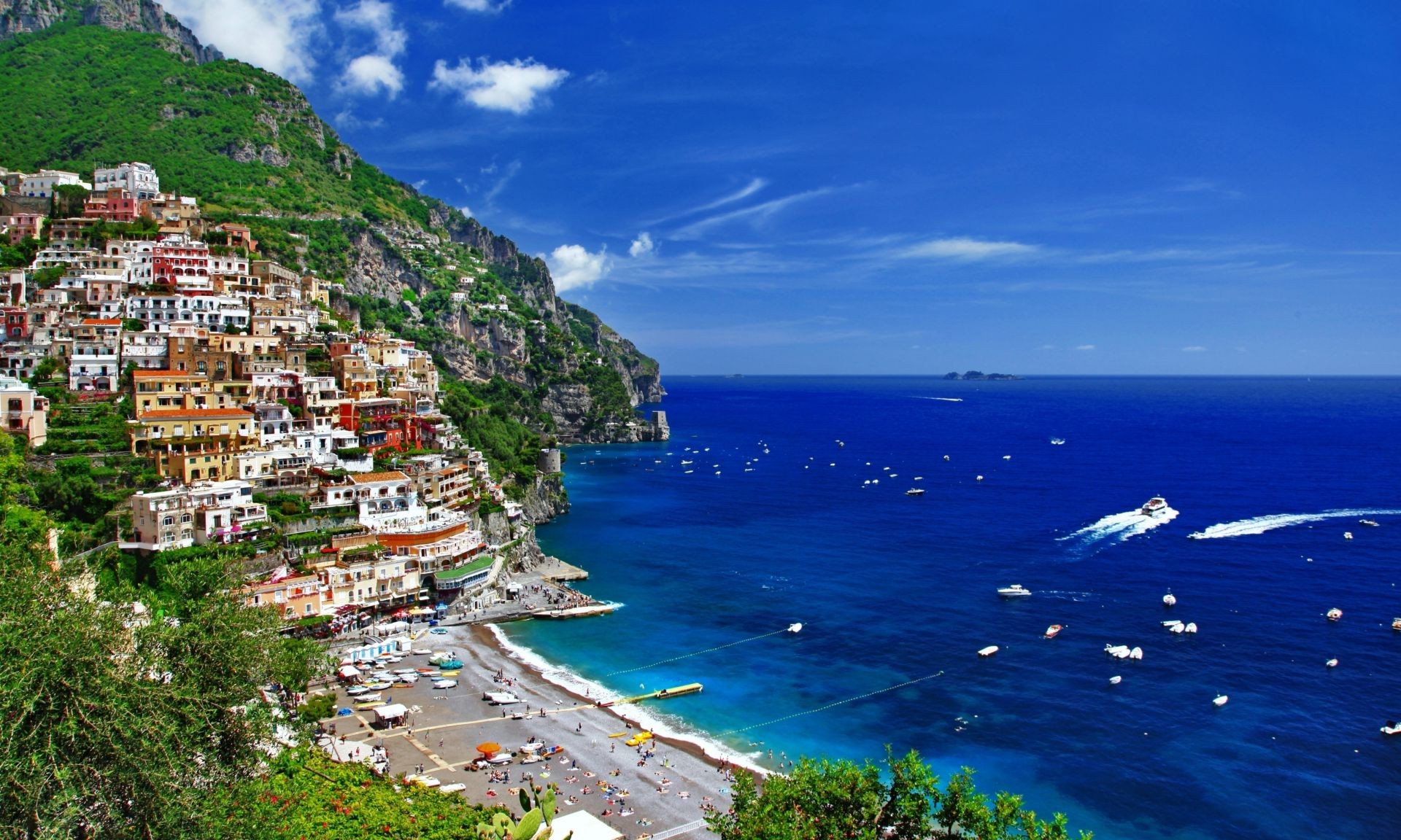 Houses in green mountains under an open blue sky with cloudsHouses in green mountains under an open blue sky with clouds
