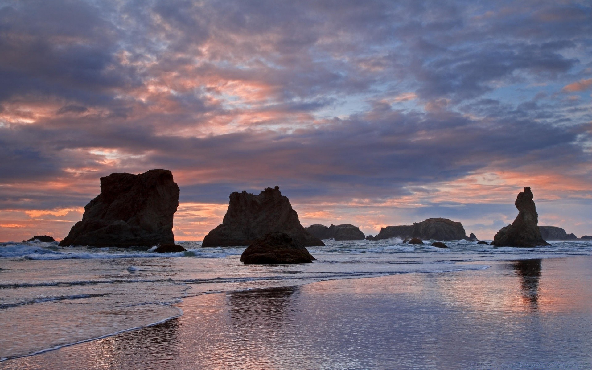 Sea, rocks, pink sunset