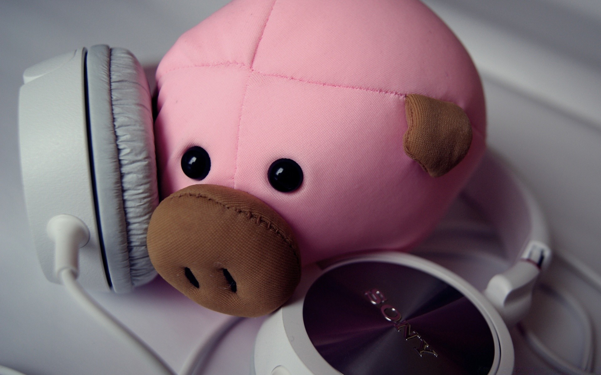 Pink pig toy with headphones
