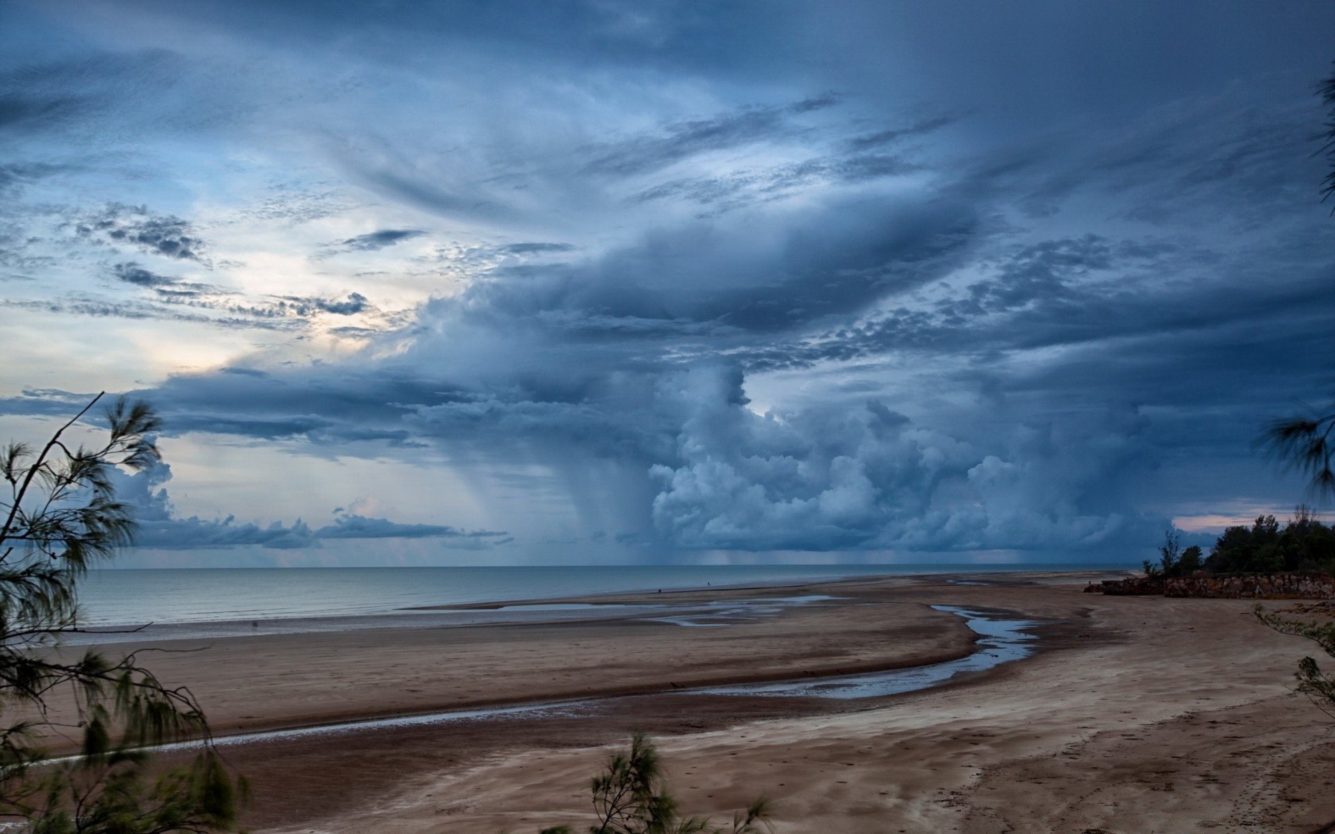 The ocean washes a rocky beach, a lighthouse is visible in the distance