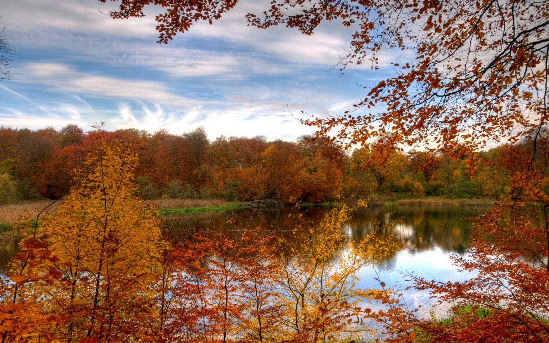 Landscape of coniferous trees whose roots are strewn with fallen leaves