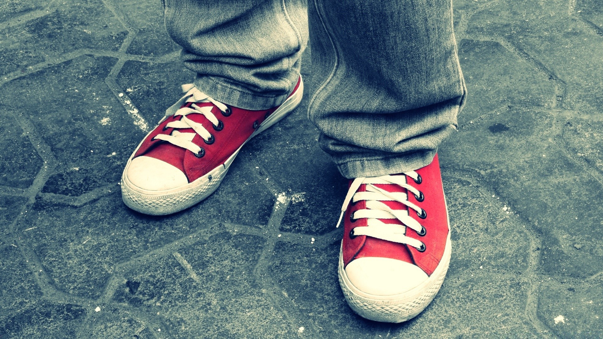 Feet in red sneakers on the asphalt