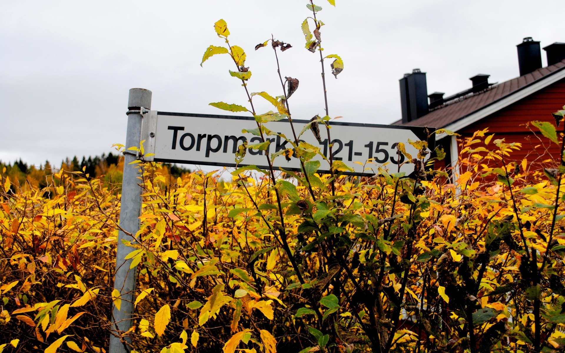 Road sign on a background of yellow leaves