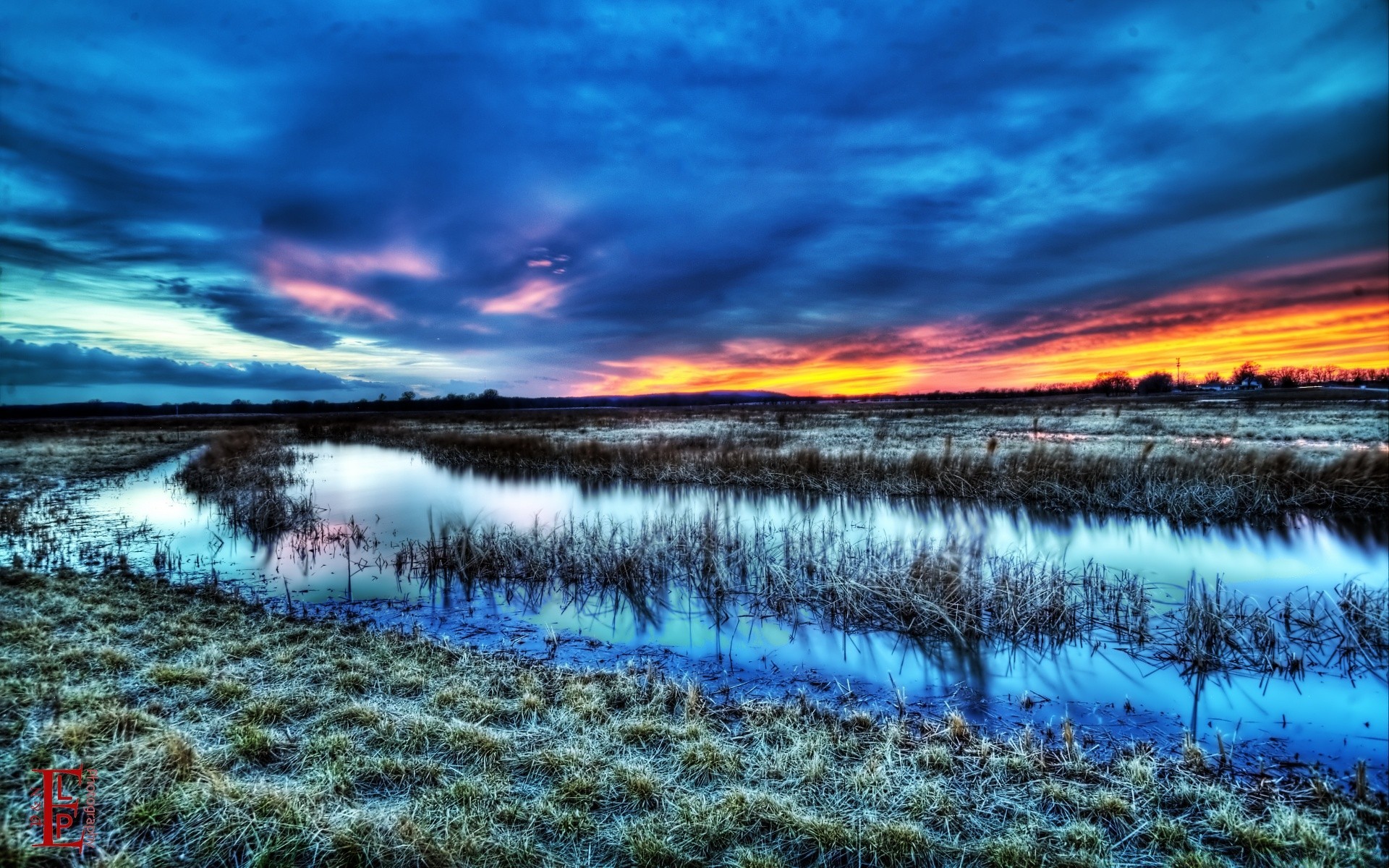 Colorful clouds on the background of grass and water