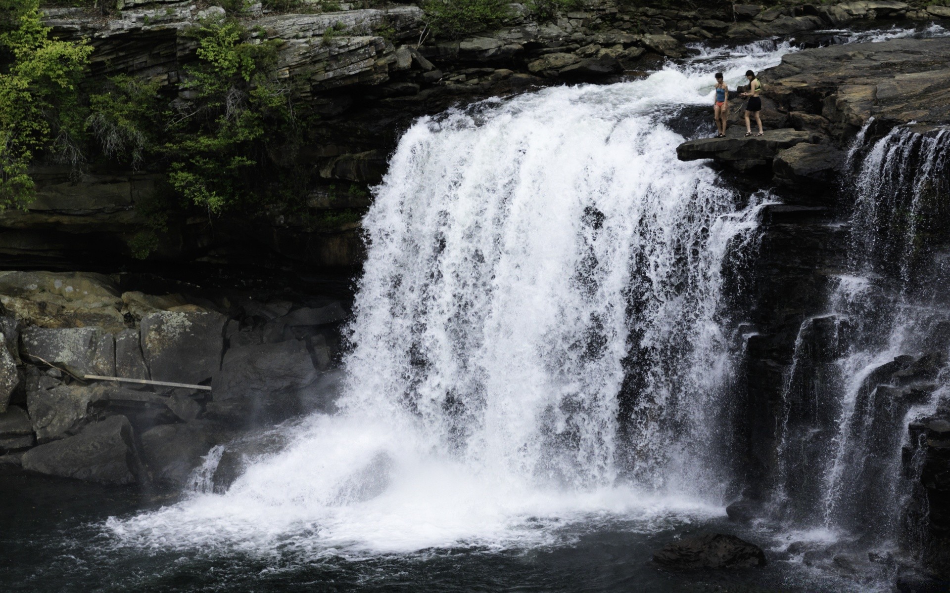 A powerful waterfall in the canyon flows into a stormy riverA powerful waterfall in the canyon flows into a stormy river