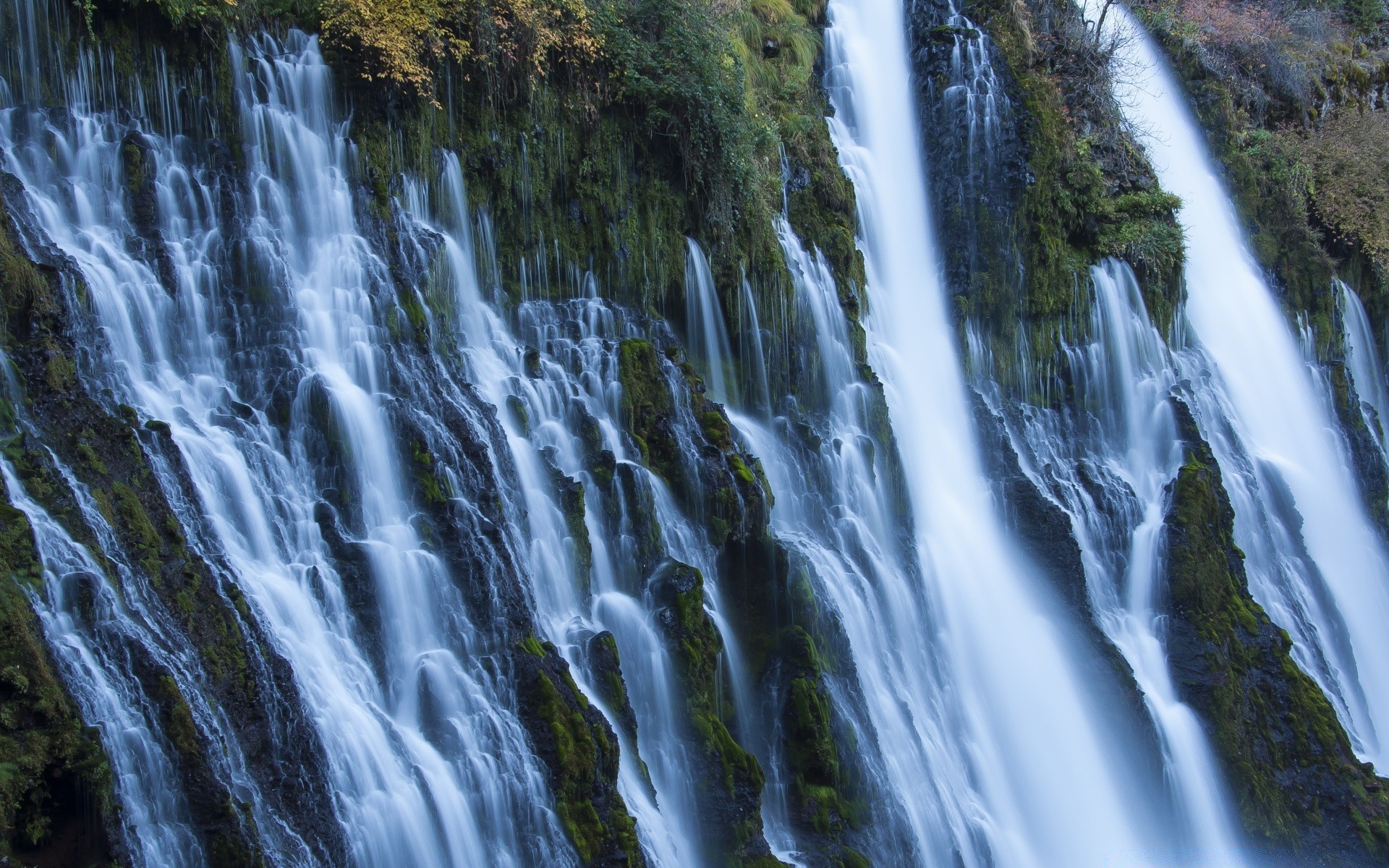 Waterfall on the background of mountains , rainbows and green treesWaterfall on the background of mountains , rainbows and green trees
