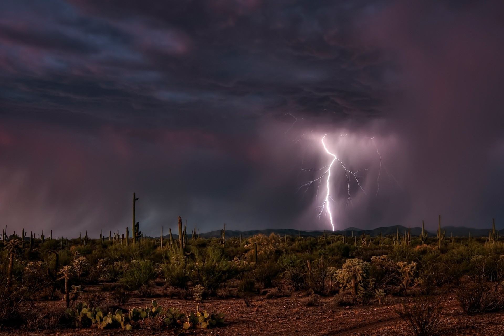 Multicolored umbrellas hang over the street between buildings against a blue sky background
