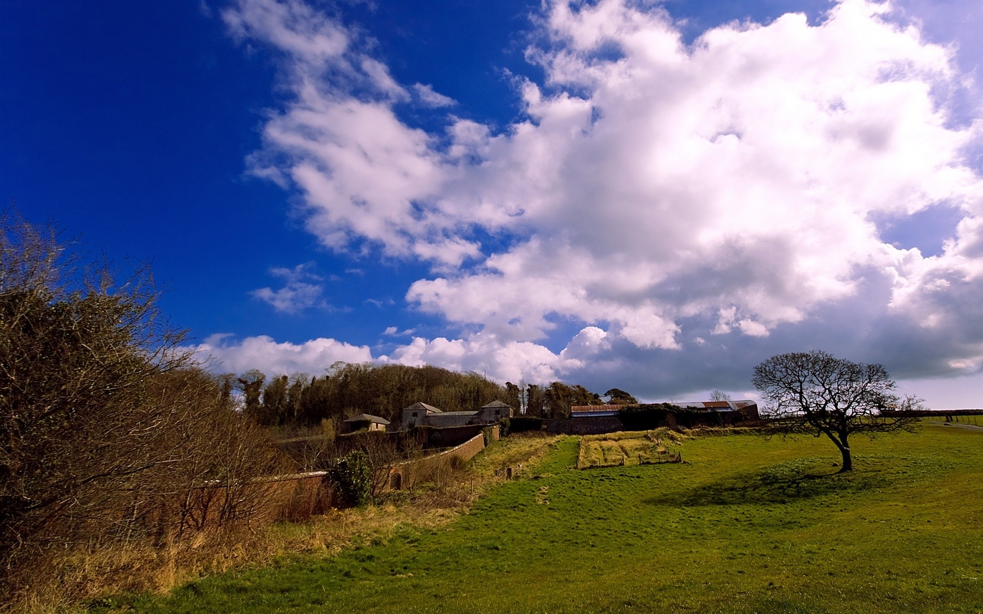 A pond surrounded by fields with yellow grass and a sky with clouds