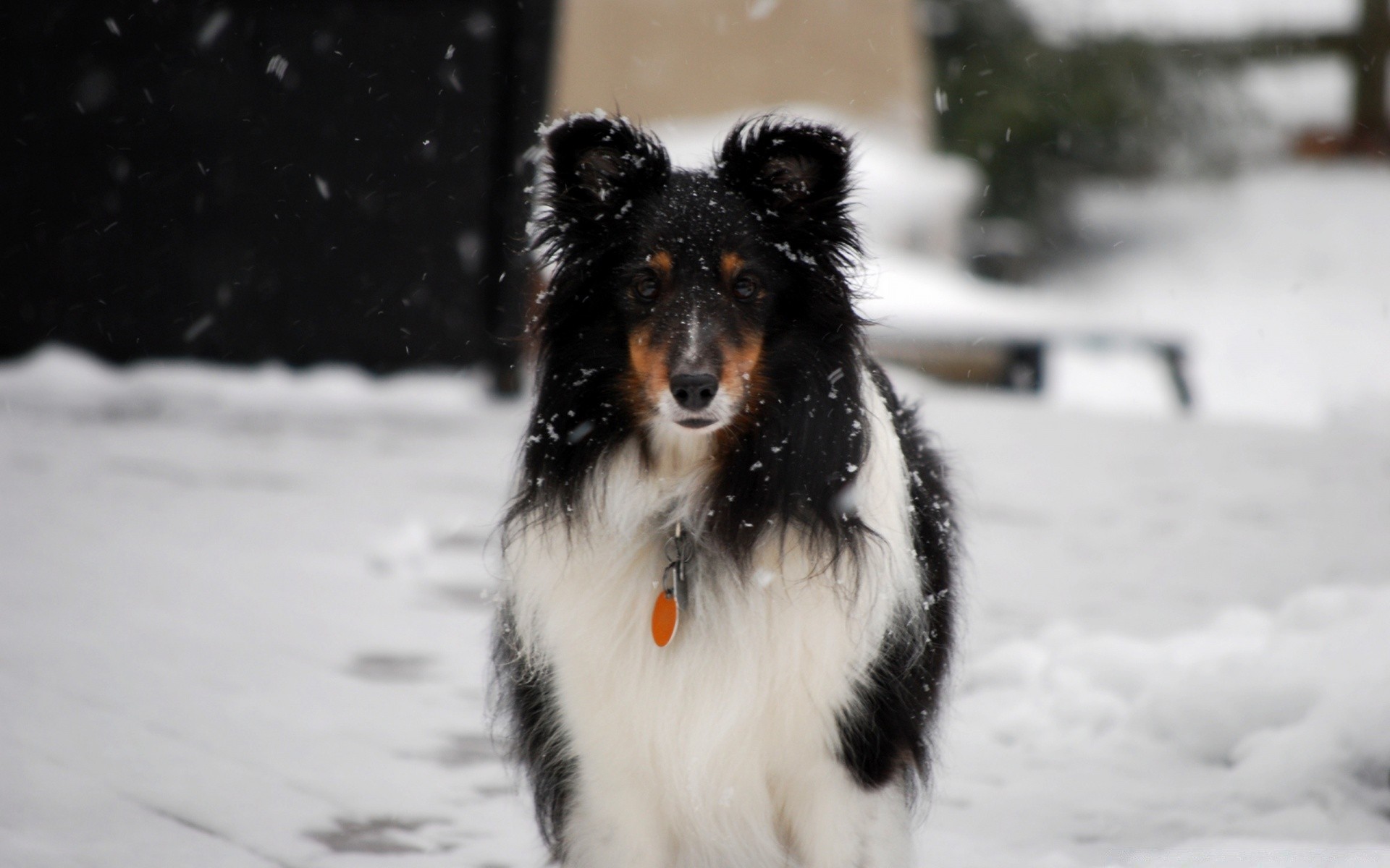 The dog stands under the falling snow