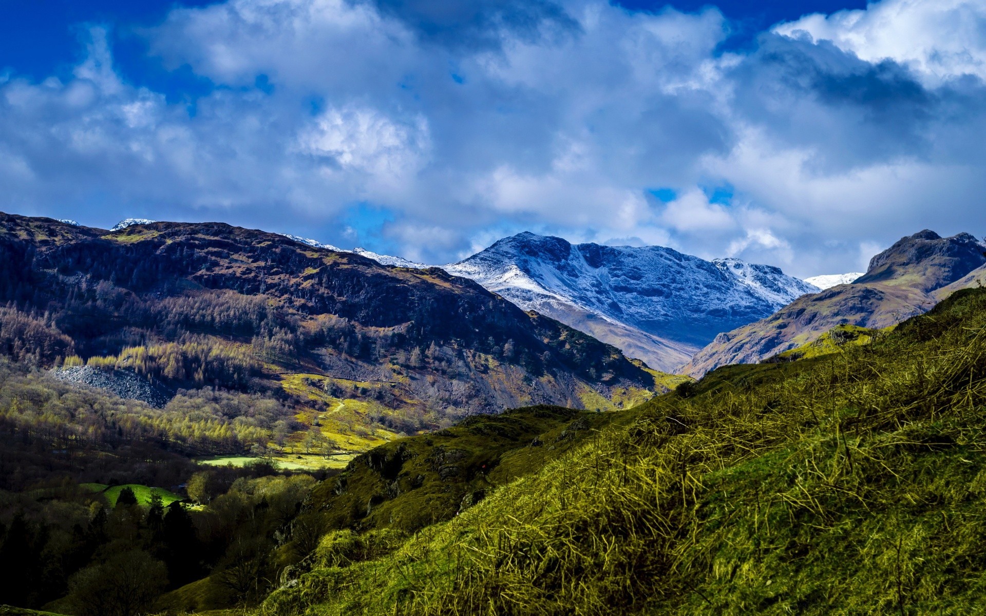 A small house with a snow-covered roof at the foot of the mountain and a blue sky with white clouds