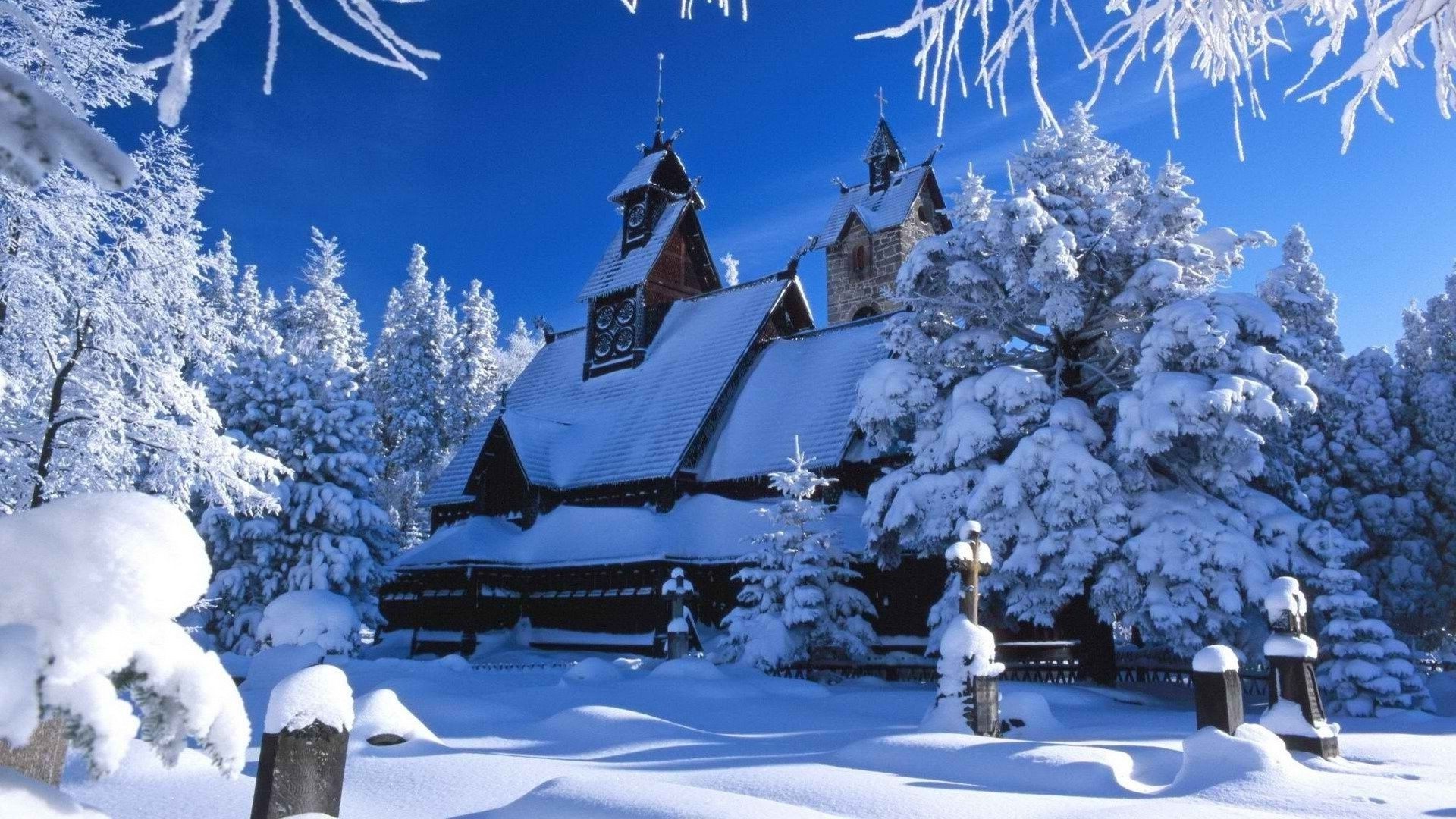 Snowy landscape the house is covered in snow