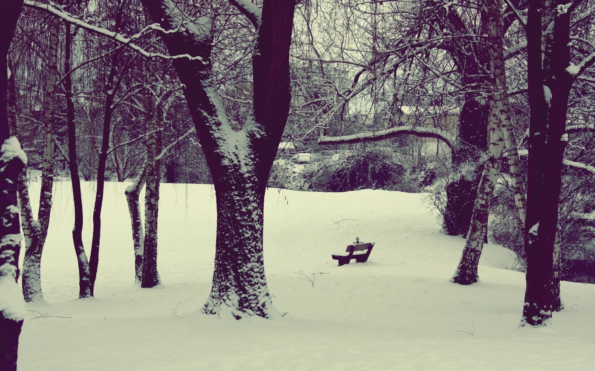 A lonely bench in a snowy forest