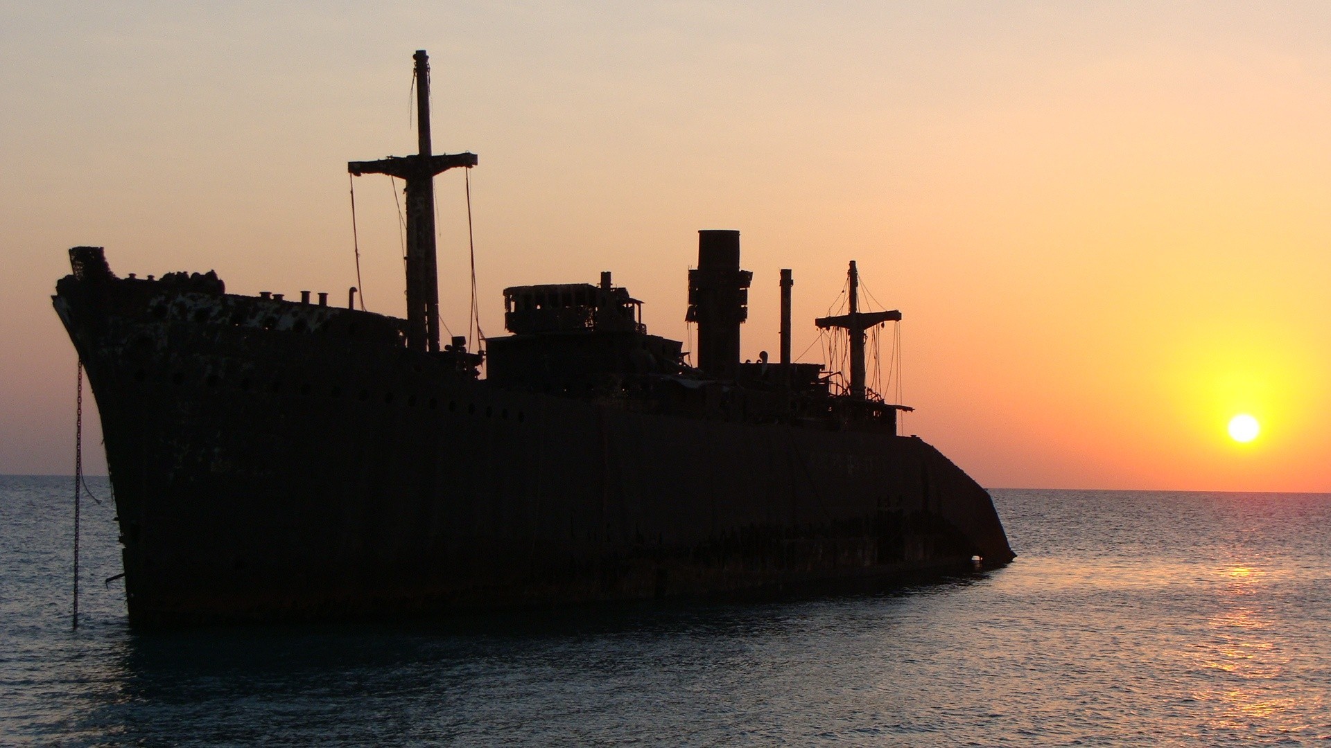 A ship at sunset on the seashore