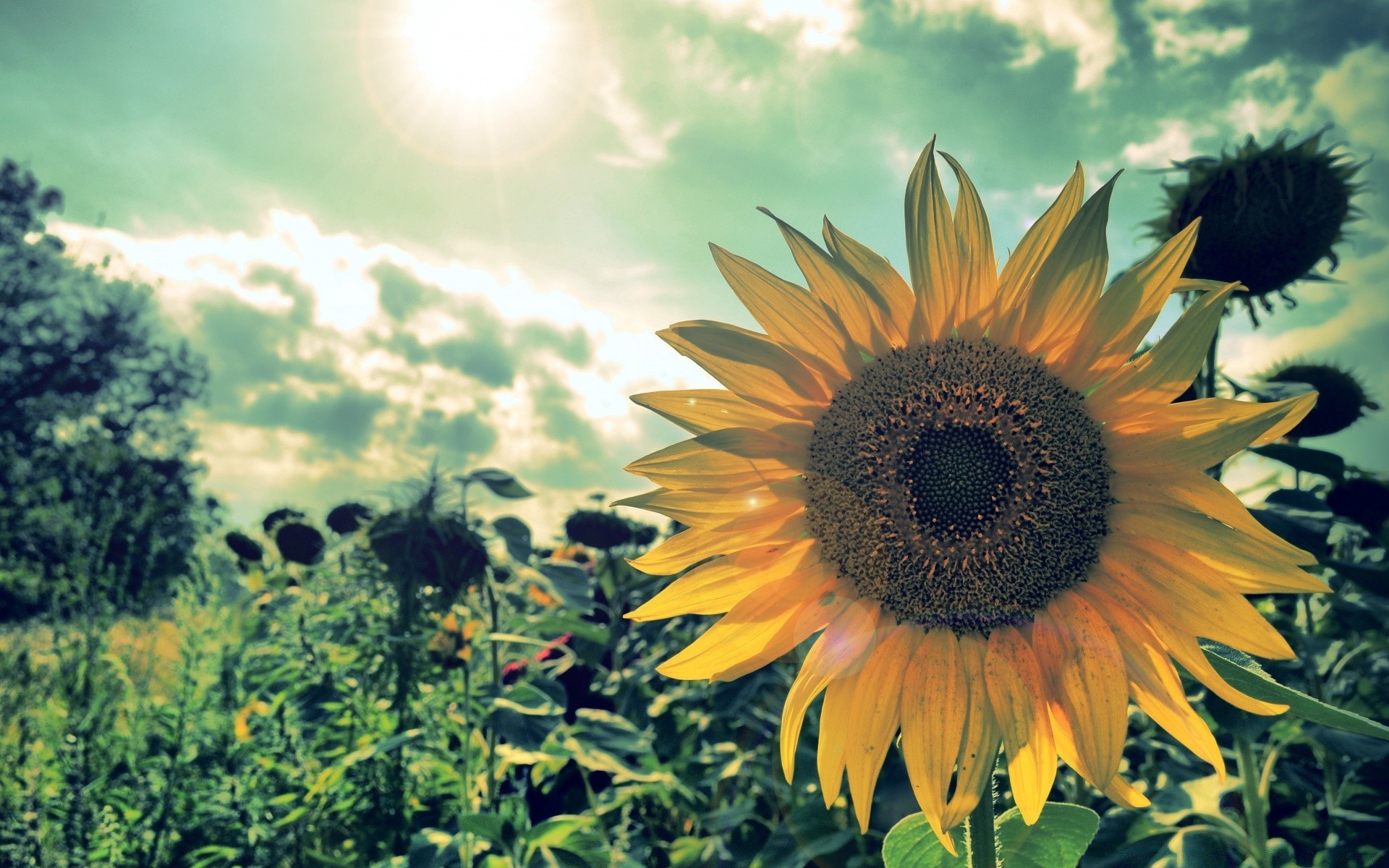 A landscape of mountainous terrain with a gloomy sky and a rainbow