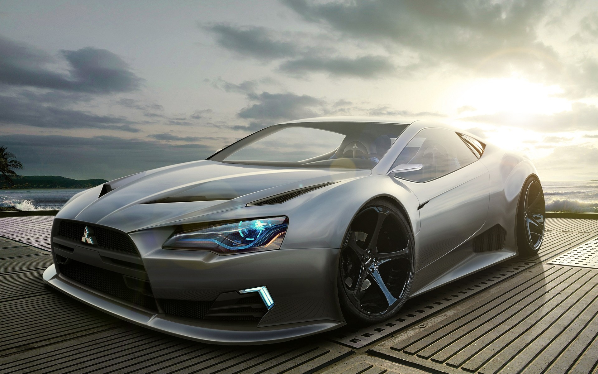 Mitsubishi car standing on a paved road against the background of the sea and skyMitsubishi car standing on a paved road against the background of the sea and sky