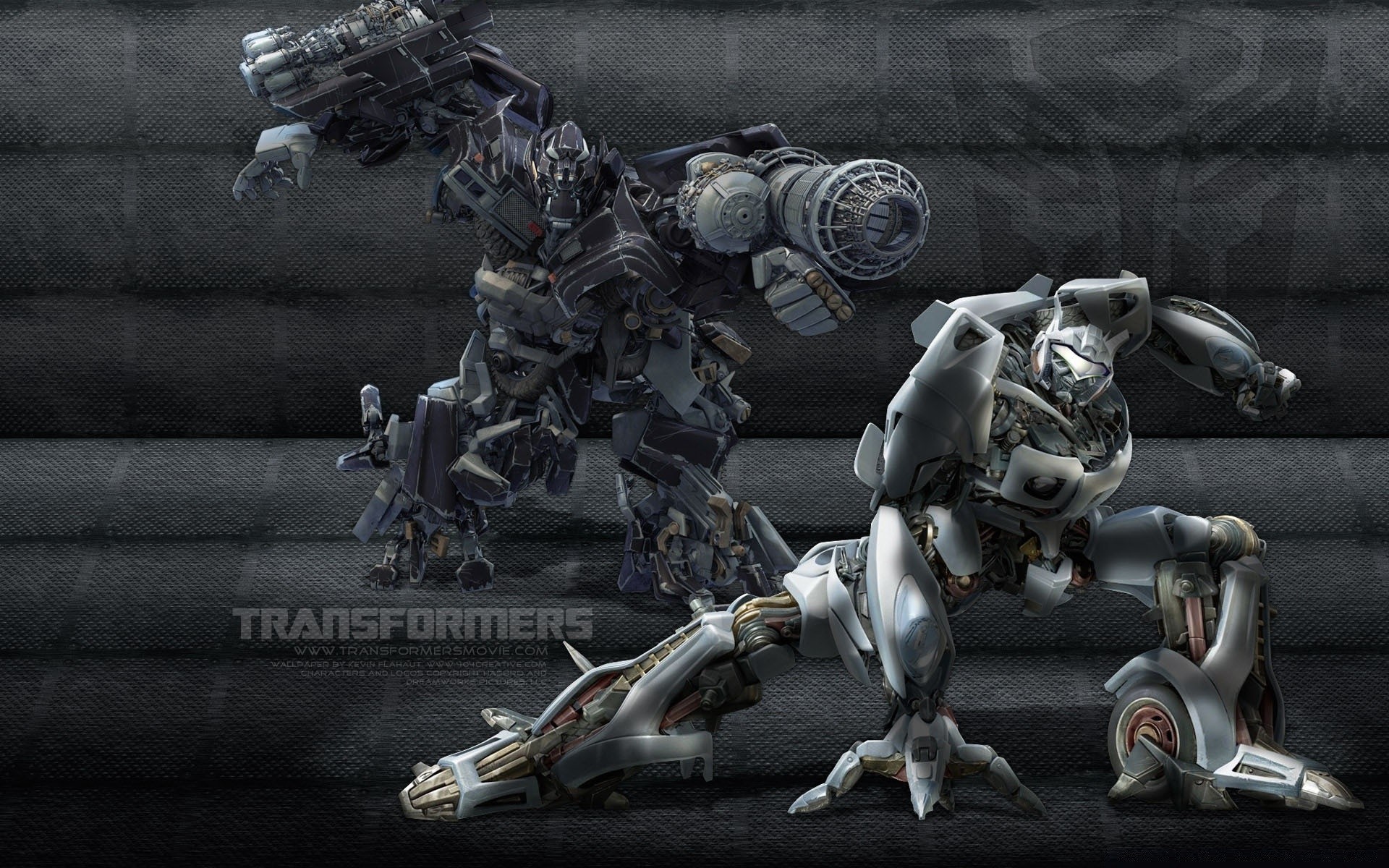 Two silver robots on a gray background