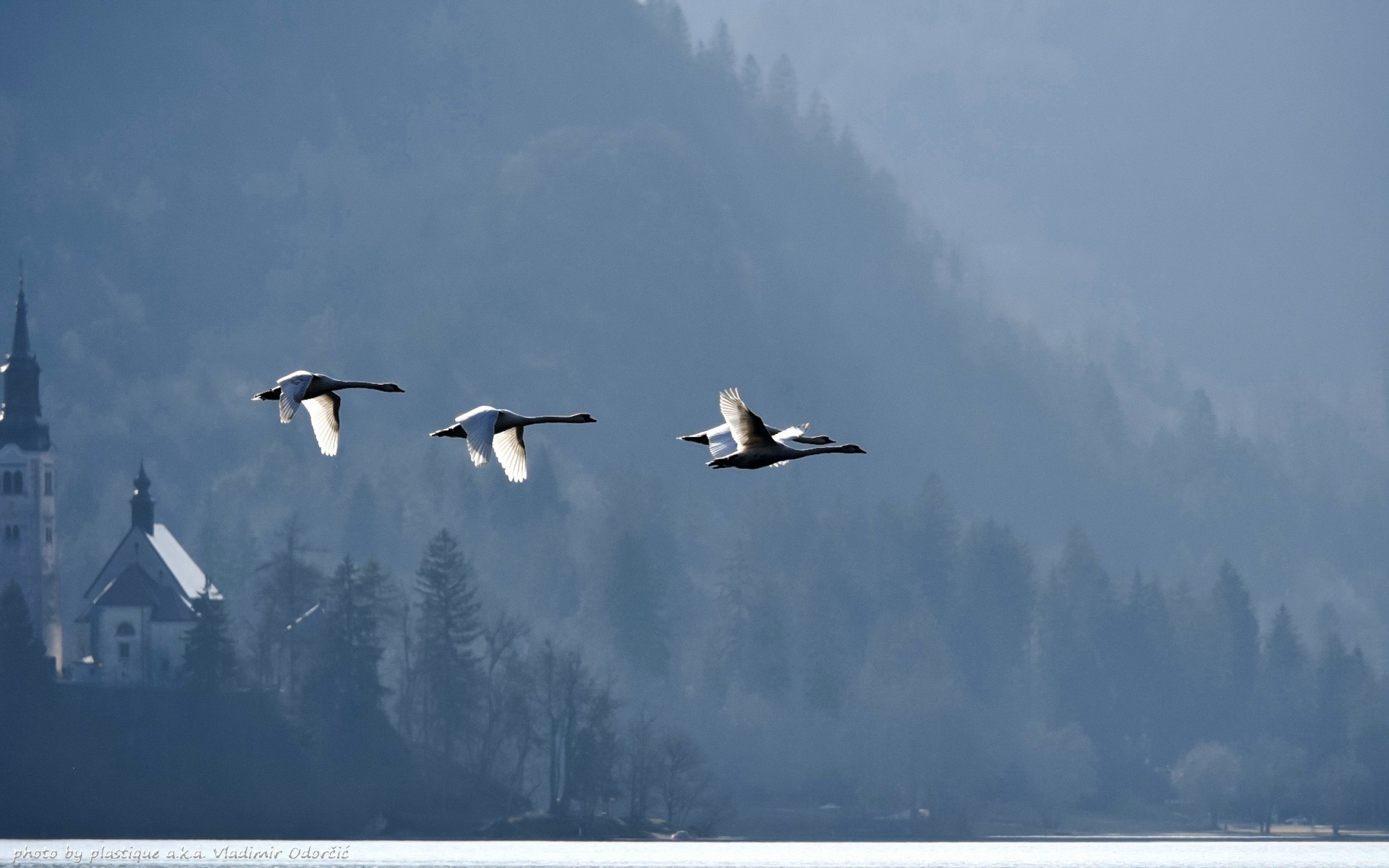 Swans flying over the lake blood by plastic aka vladimir odorcic