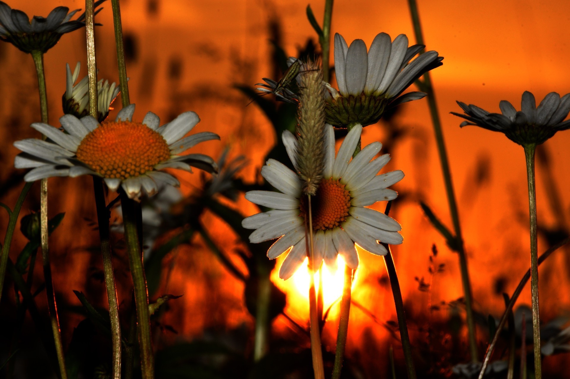 Summer meadow daisies at sunset