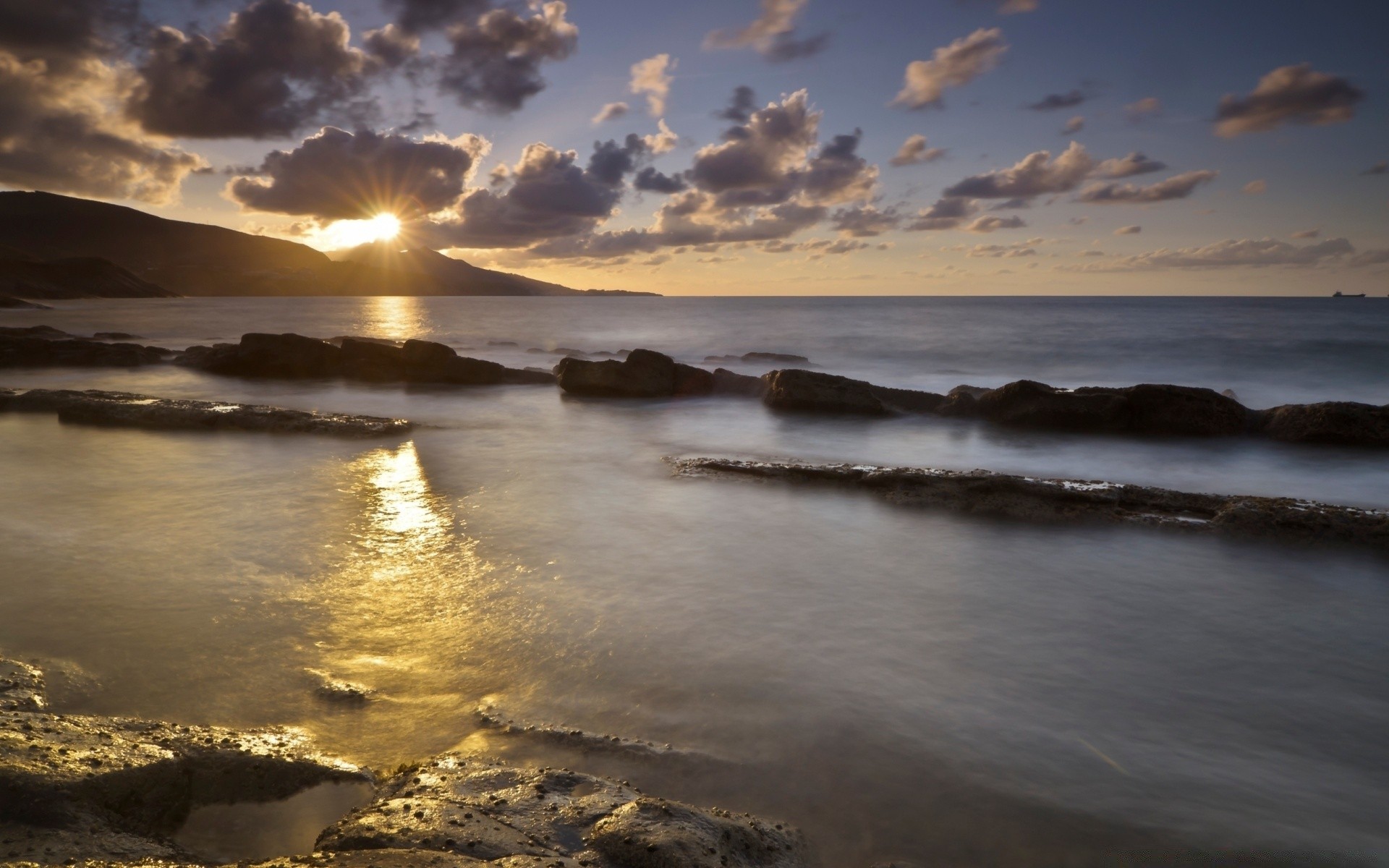 The sun appeared over the mountain, in front of which the water surface stretched
