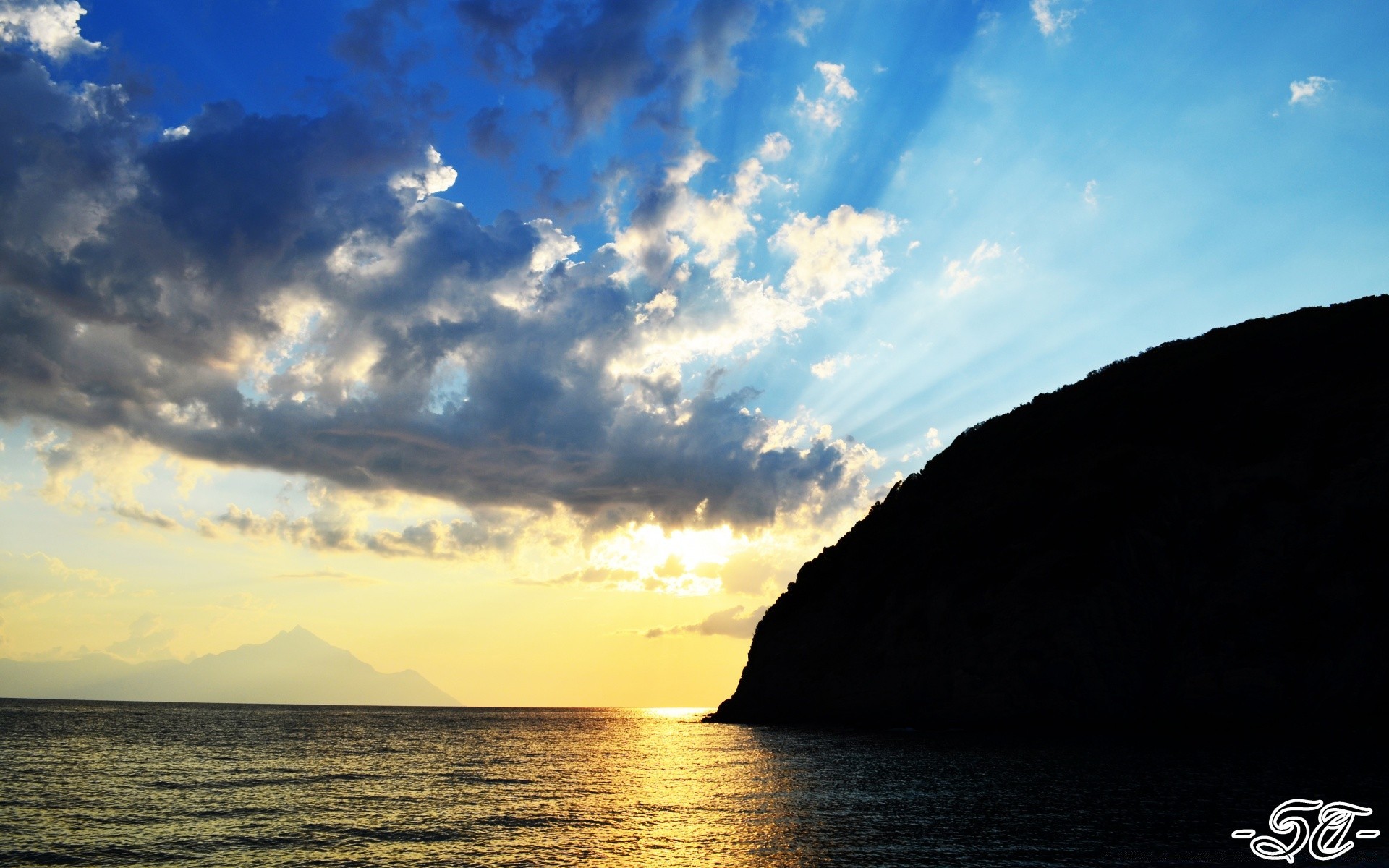 The sun is behind the clouds near the water