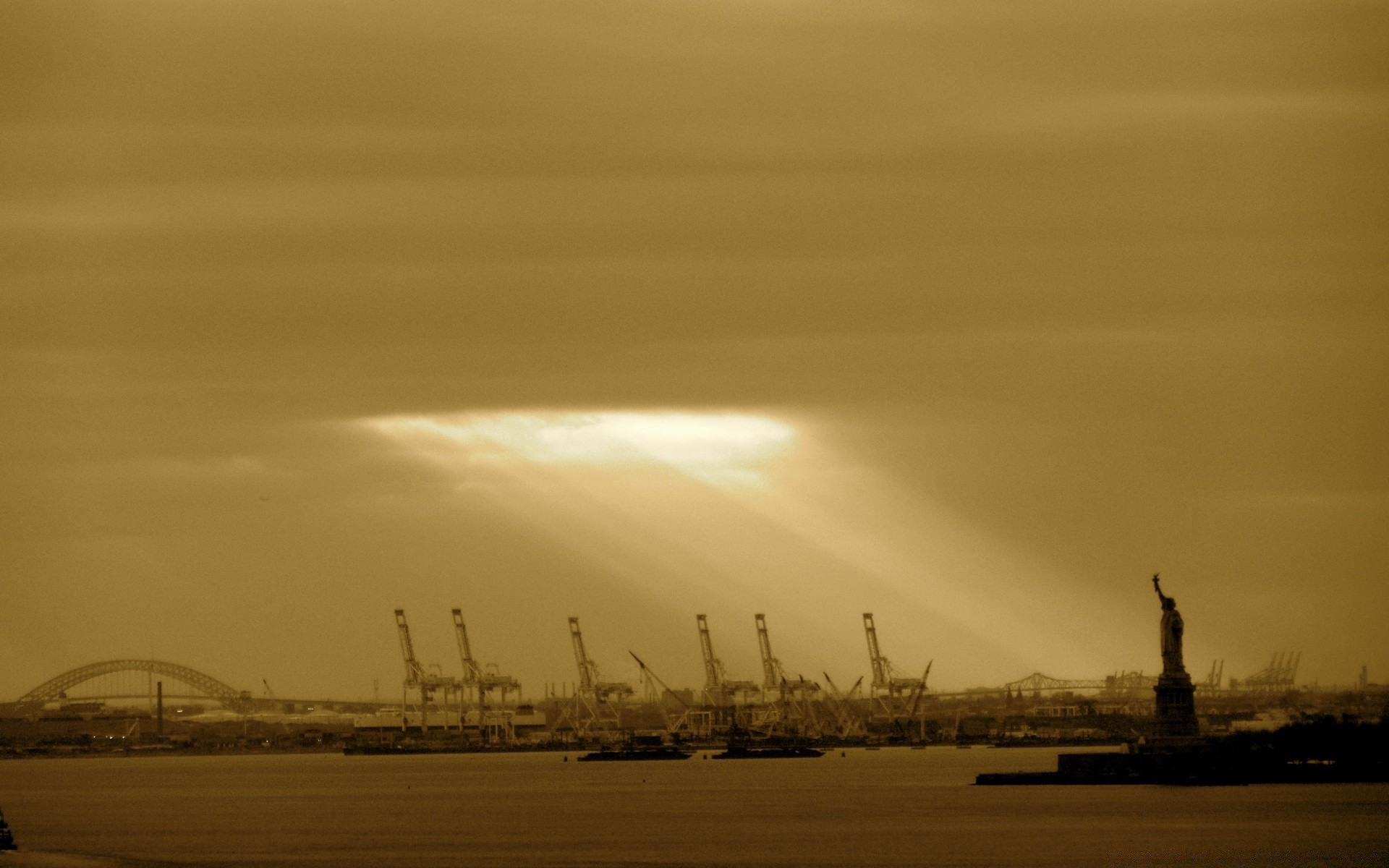 The sun's rays break through the clouds and illuminate the Statue of Liberty