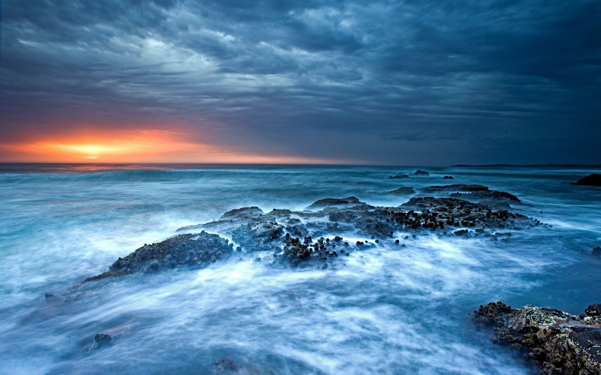 The departing sun over the raging water