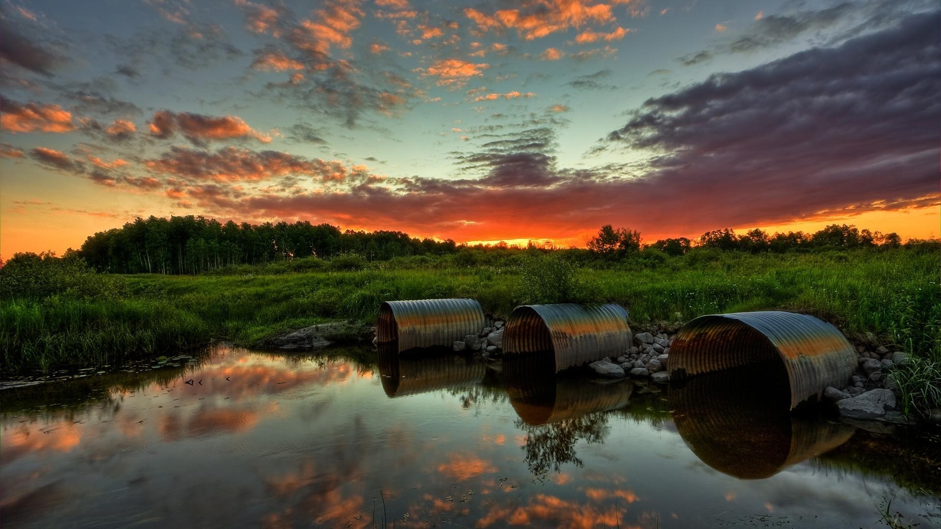 River in the green grass at sunset