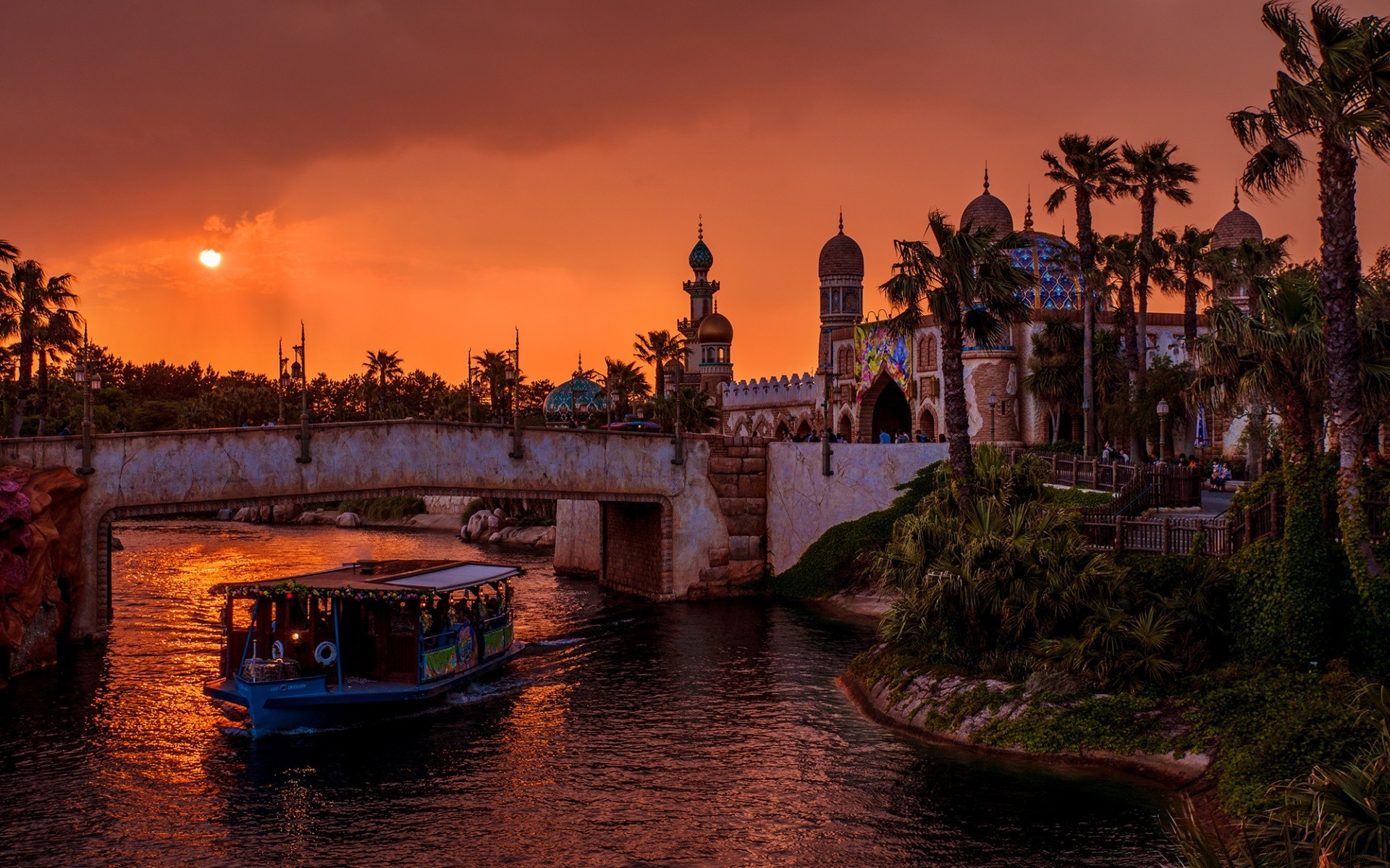 The architecture of the city at sunset. Reflection of the sky in the water during the journey