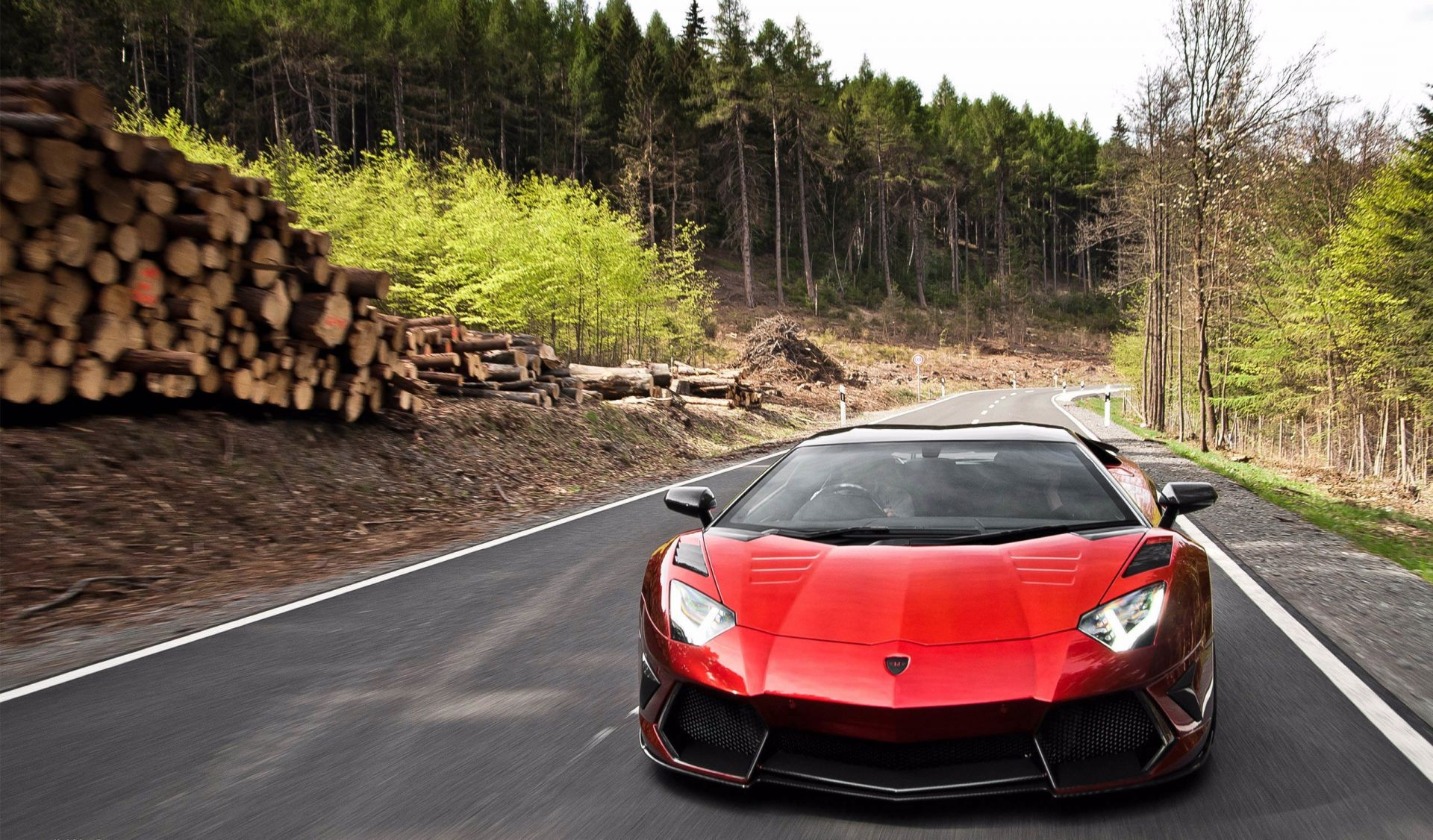 A sports car is eating on the road in the forest