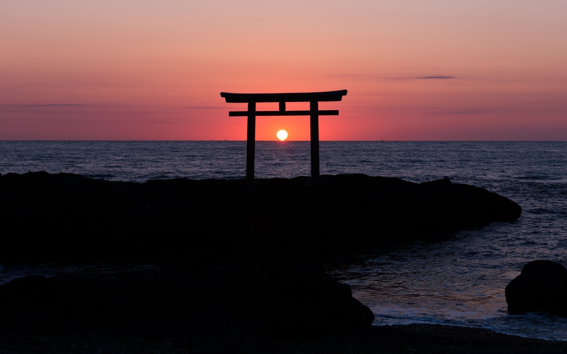 The silhouette of houses with palm trees in the eternal sky reflected in the water