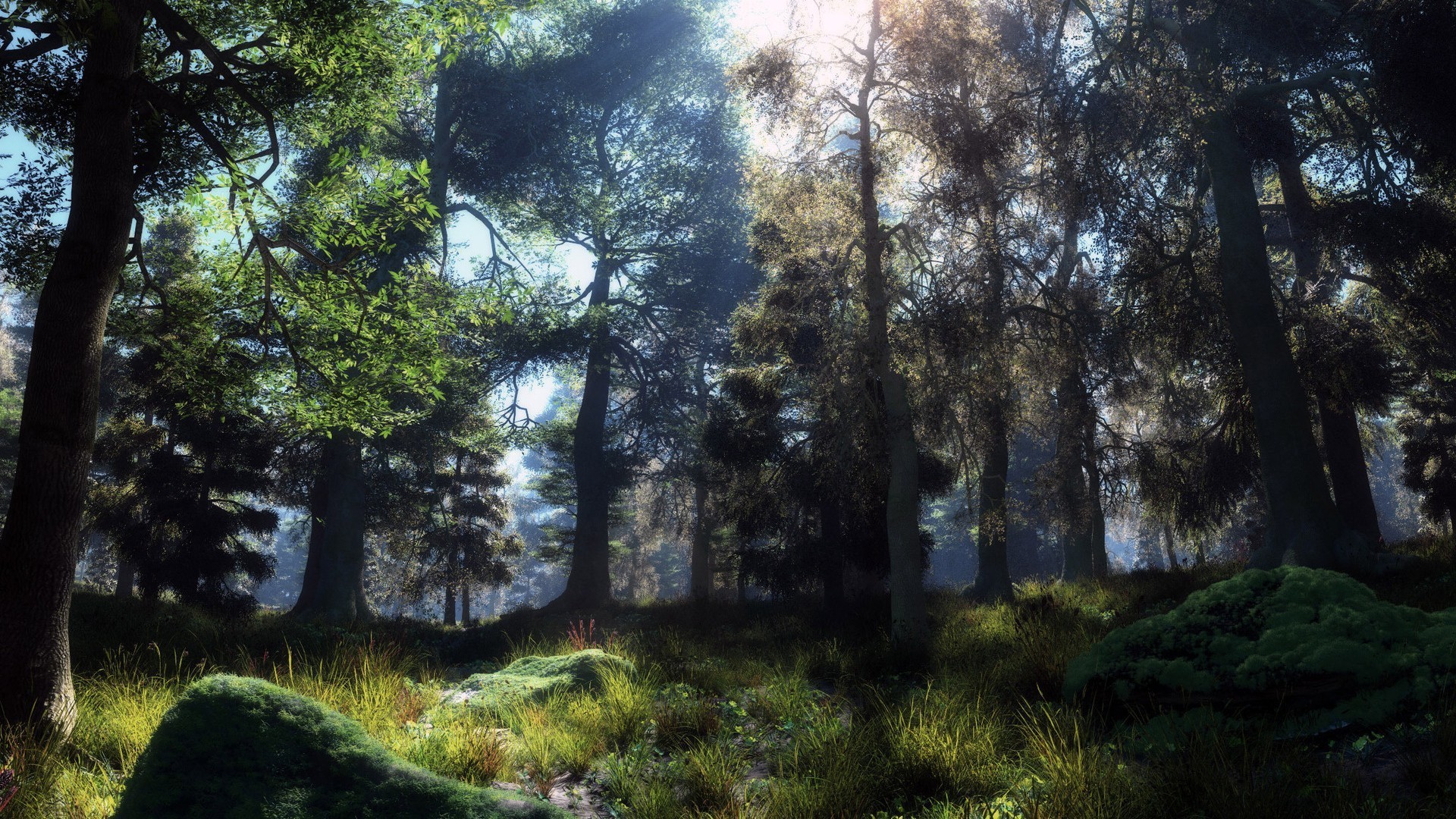 The sun breaks through the crowns of trees in the forest