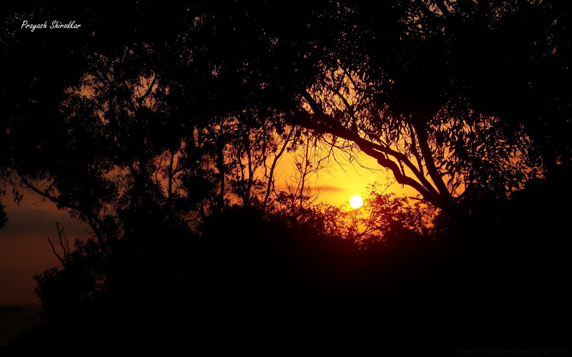 Dark silhouettes of trees by the water against the background of the red sunset sun