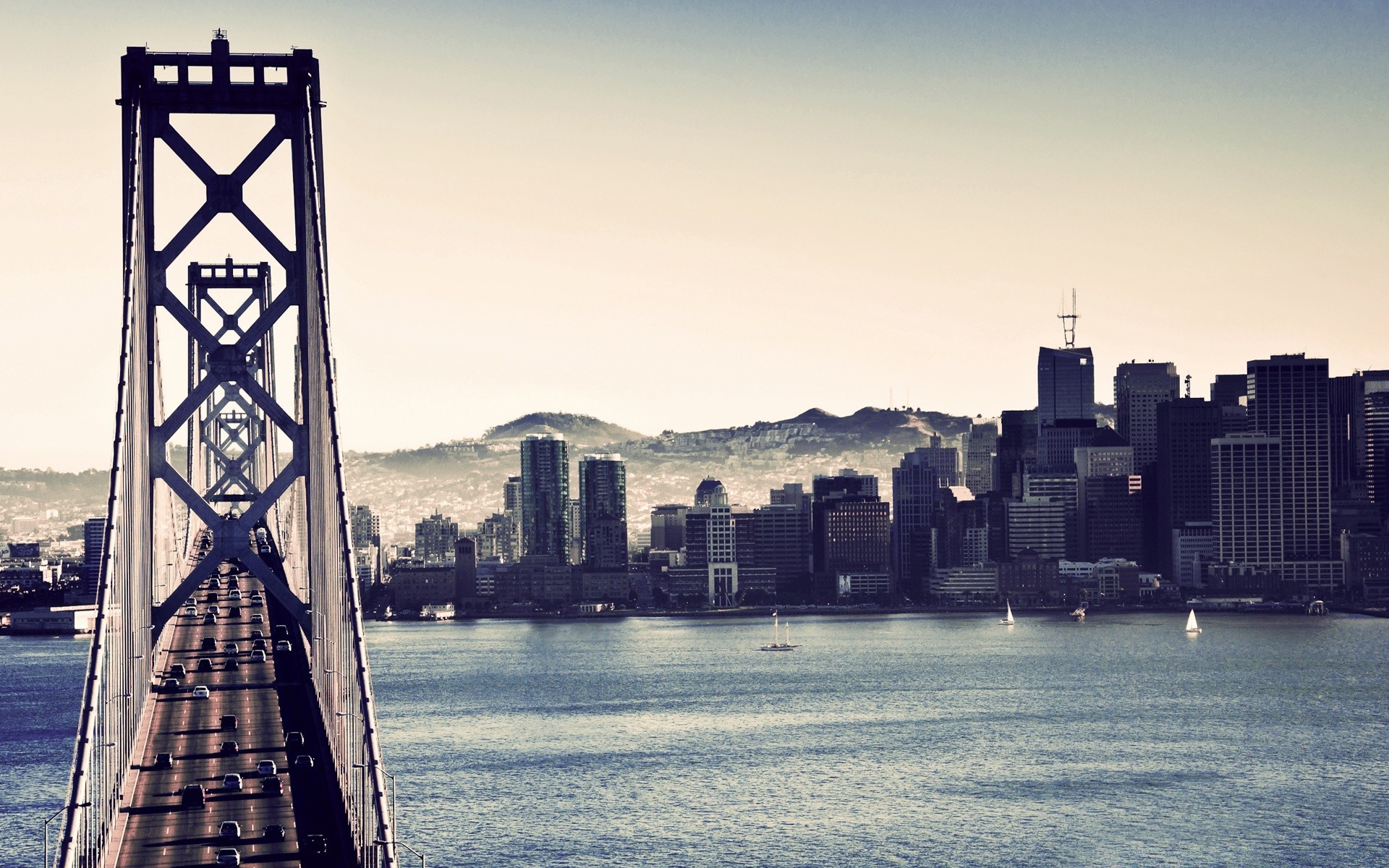Magnificent view from above of the skyscrapers of the metropolis, the bay, cloudy sky