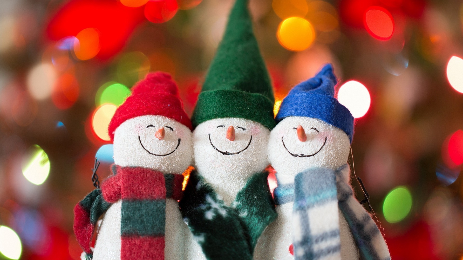 Three funny snowmen with hats of different colors