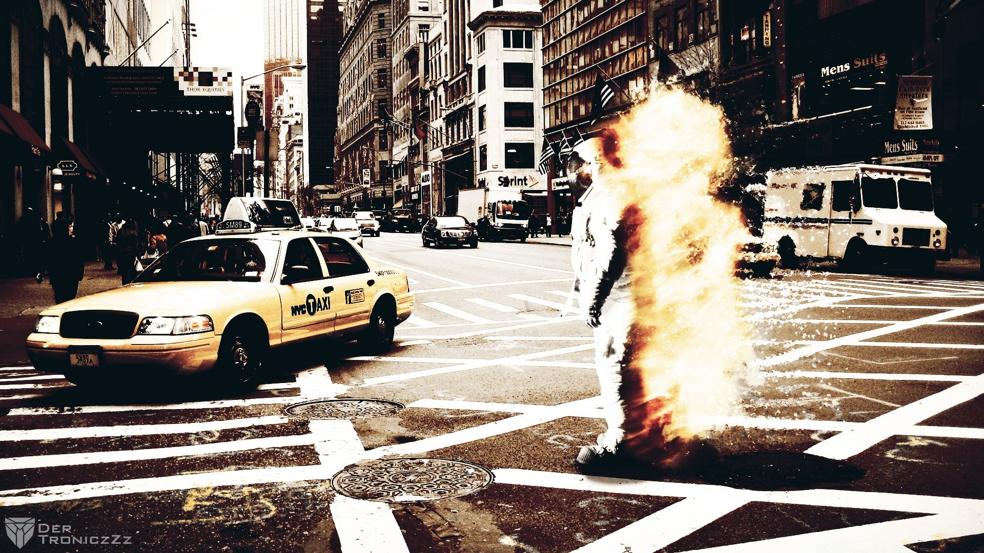 A burning man on a city street