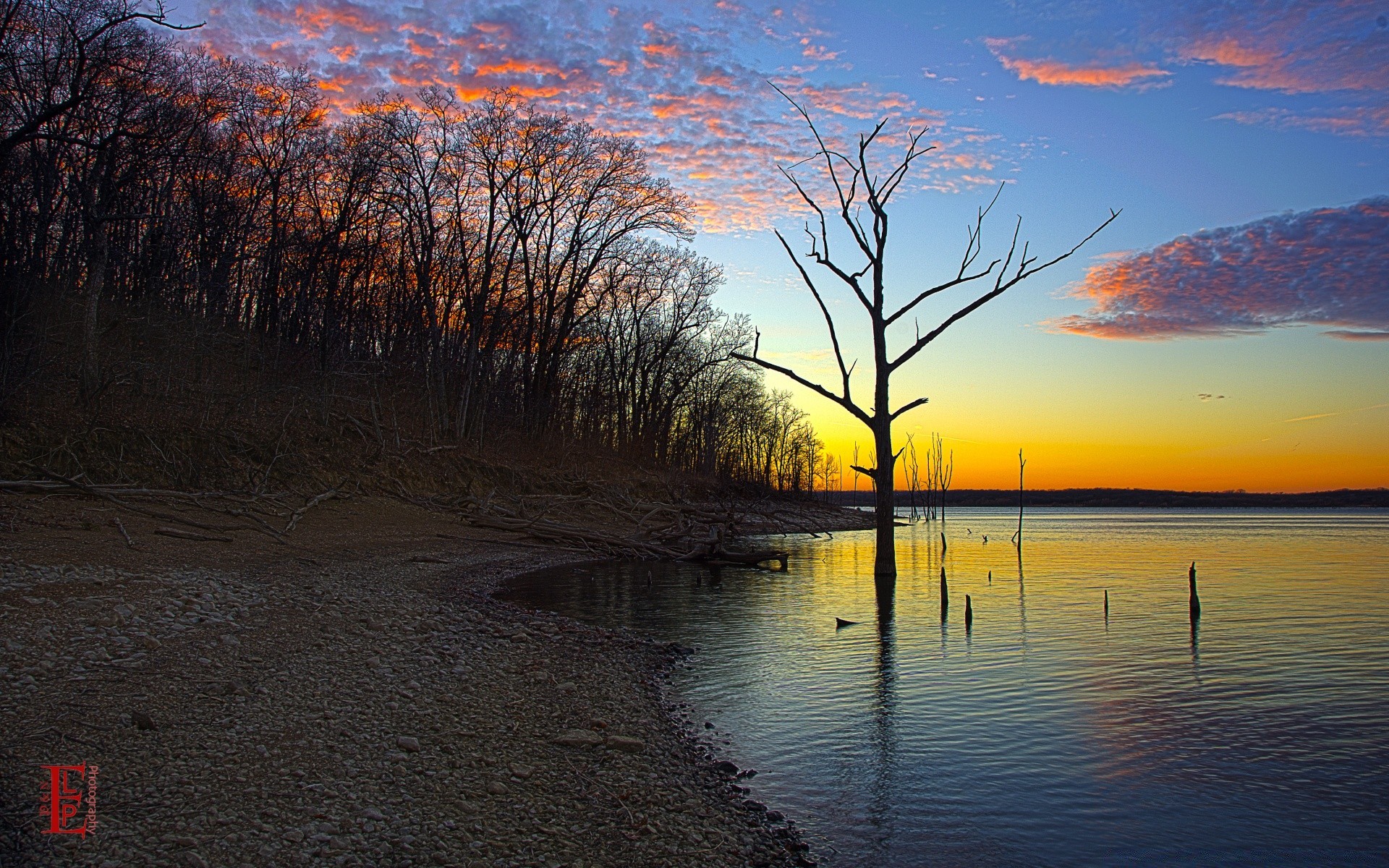 A dry tree against the background of a beautiful sunset on a pond whose shore is paros with treesA dry tree against the background of a beautiful sunset on a pond whose shore is paros with trees