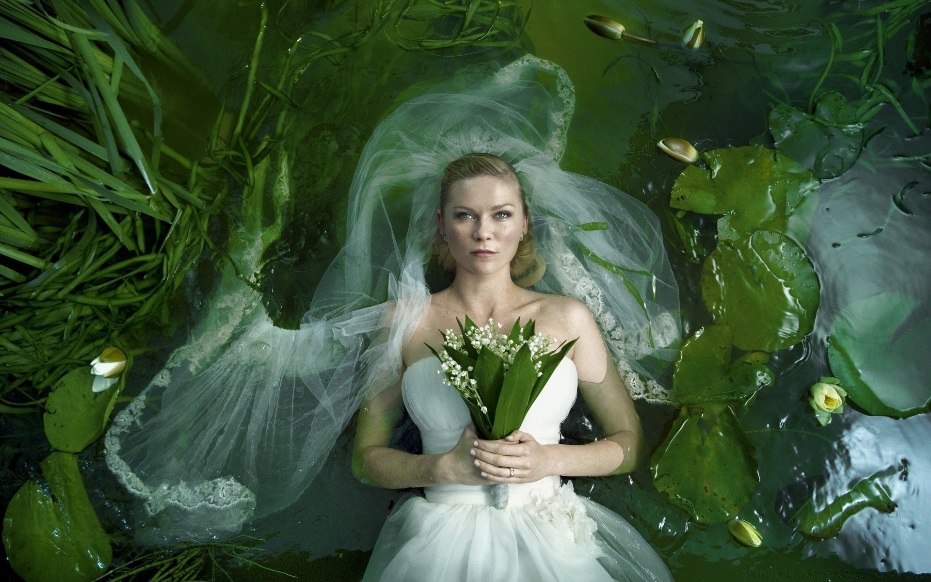 Bride with a bouquet of lilies of the valley in a white dress