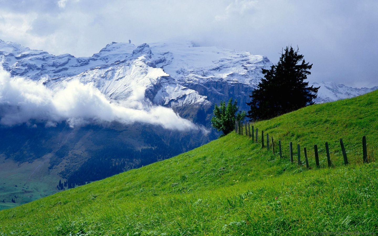 Mountain peaks in the snow. Clouds around mountain peaks. Autumn forest at the foot of the mountains