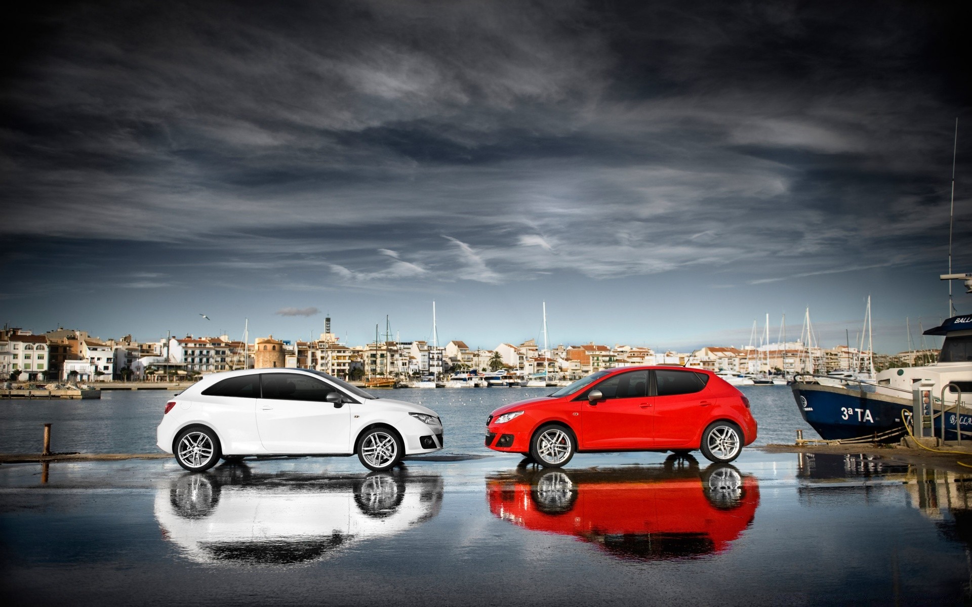 Staged photo of two cars by the water