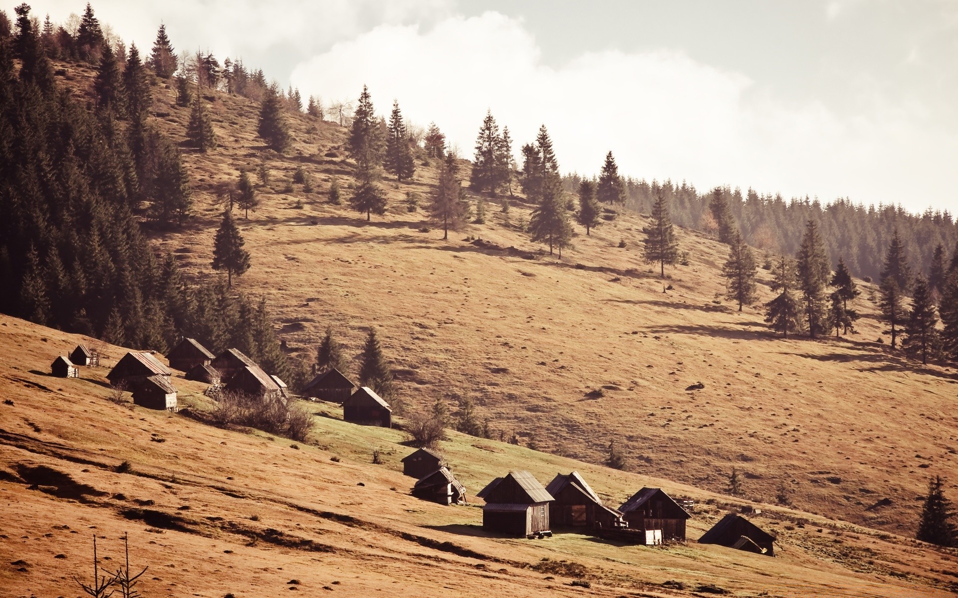 Houses in the mountains under the slope vintage