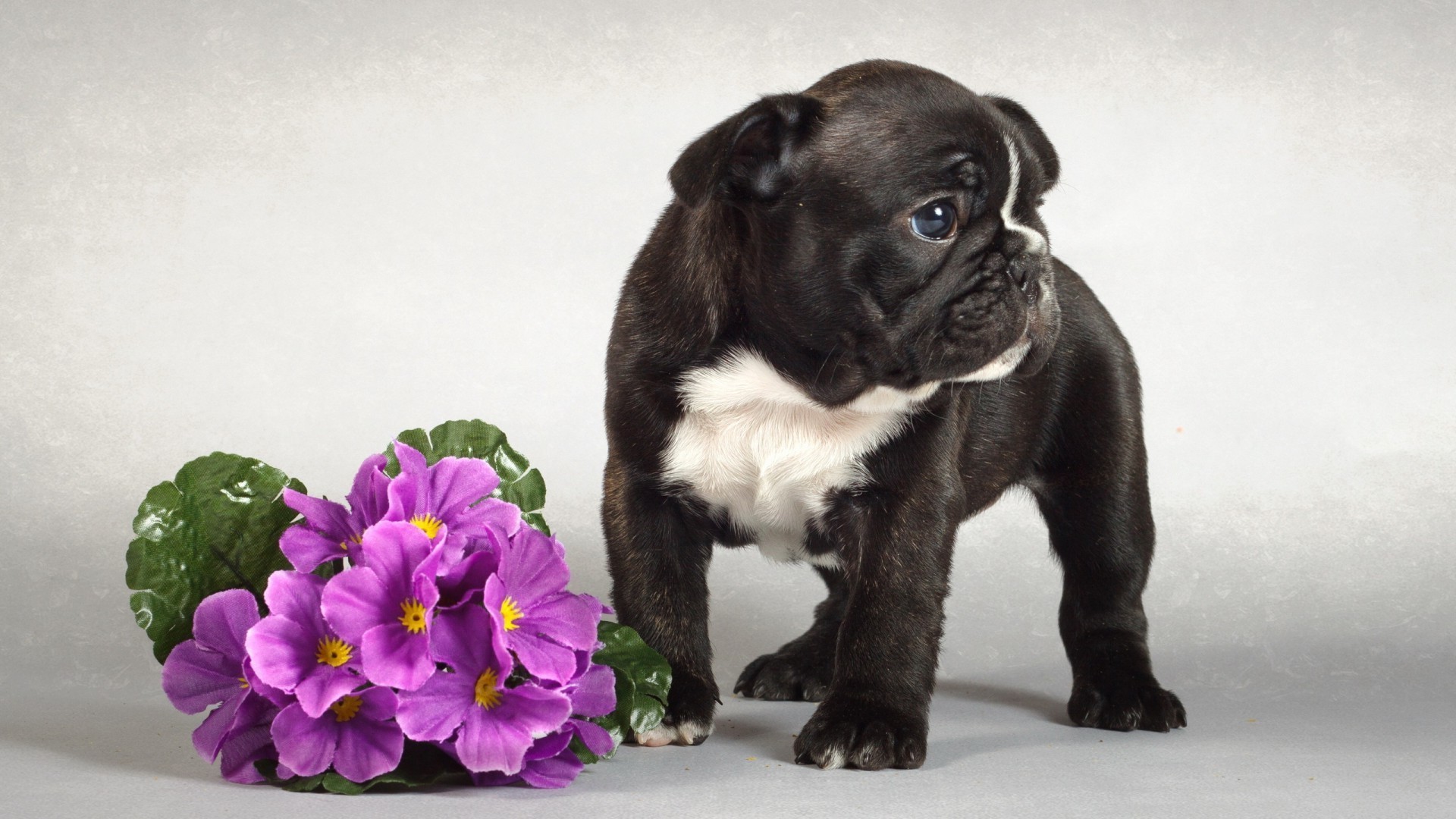 A black puppy stands next to a violet