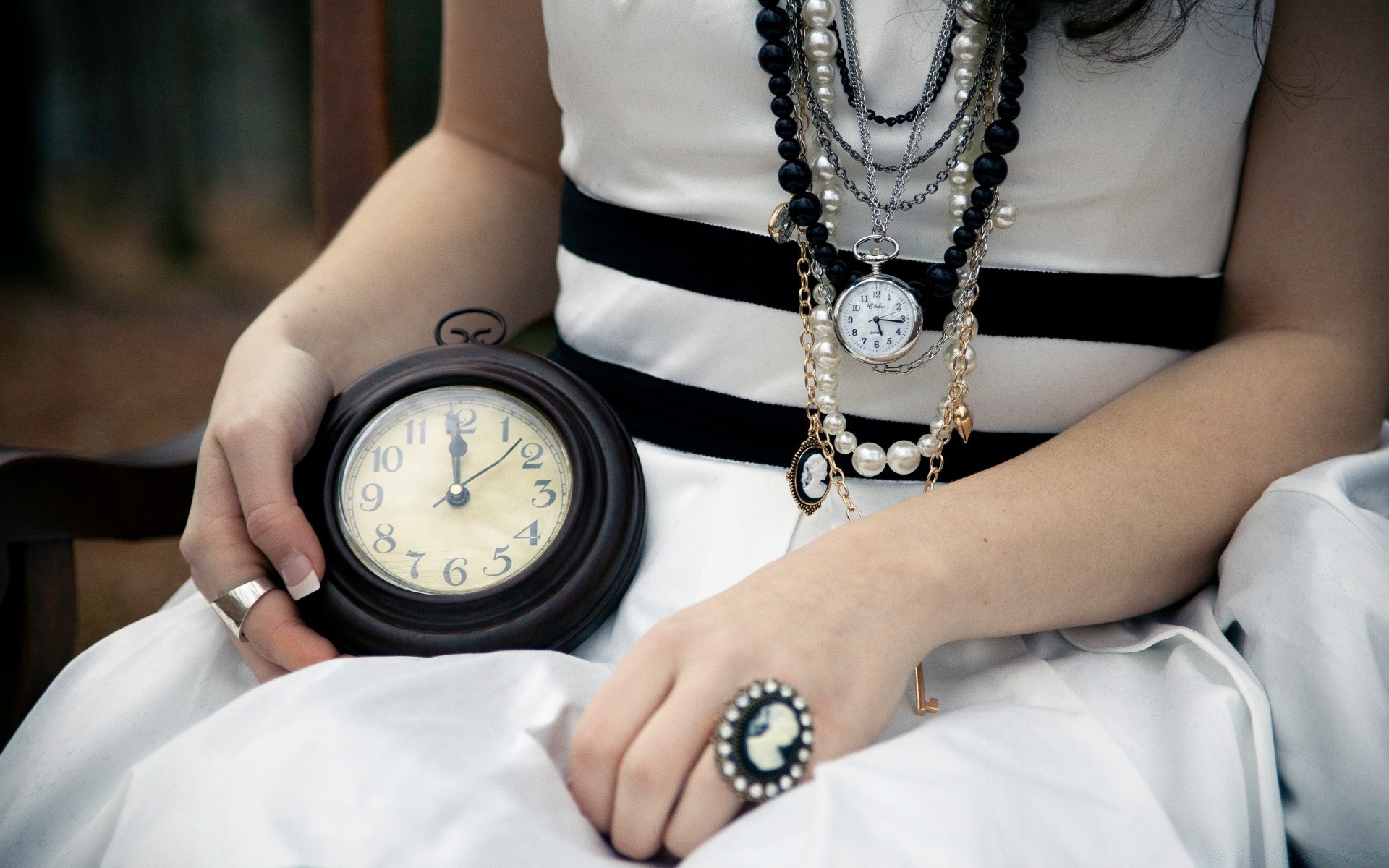 An adult woman in a white dress with a watch on her lapAn adult woman in a white dress with a watch on her lap
