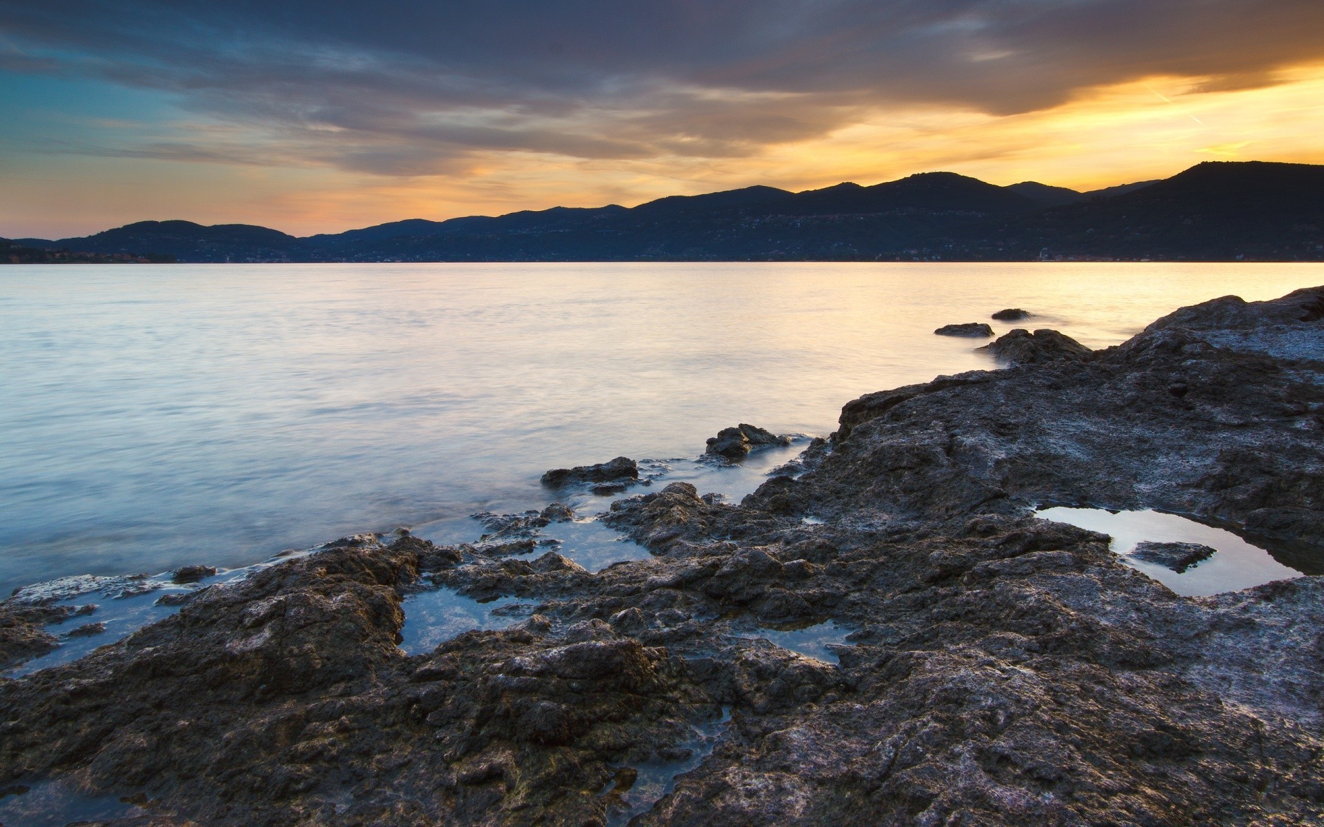 The grey rocky shore is washed by water