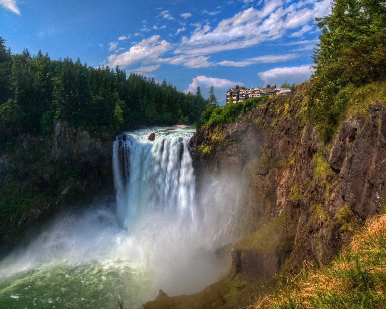 Autumn forest with a house on the edge of a waterfall
